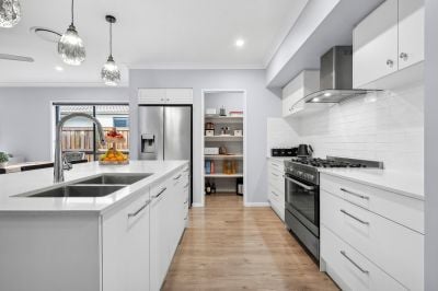 - Gourmet Kitchen: A chef's paradise, featuring a stunning white kitchen with a grand island bench and stylish pendant lighting. Equipped with a 900mm gas cooktop, under-mount sink, and generous storage, along with a walk-in pantry for added convenience.