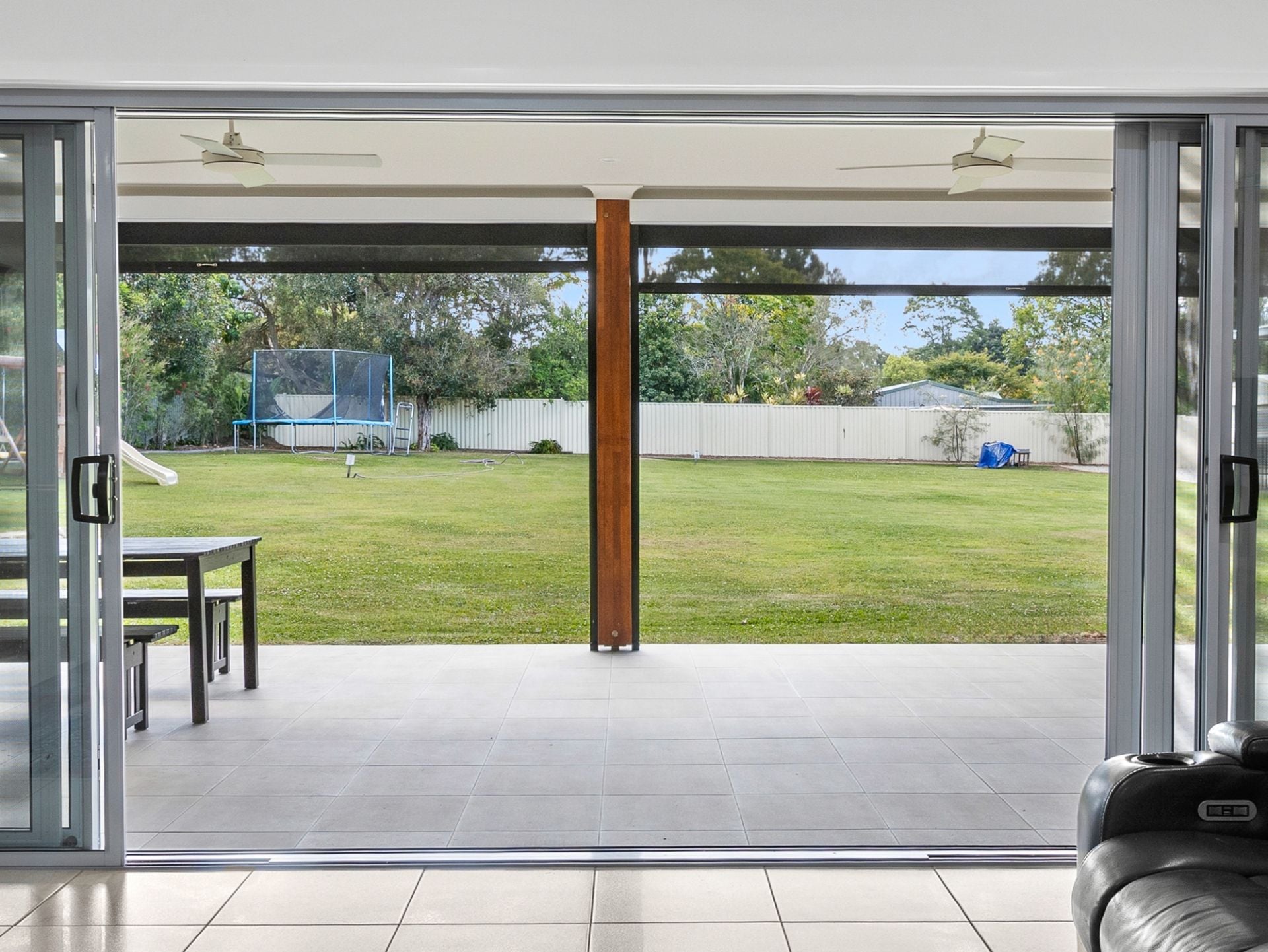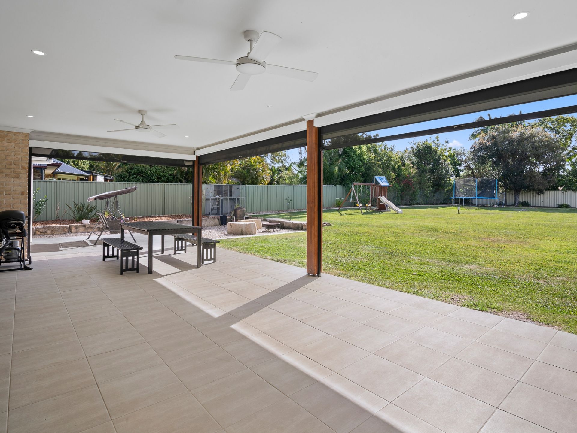 • Expansive open-plan living flowing to huge tiled alfresco with roller blinds and firepit zone