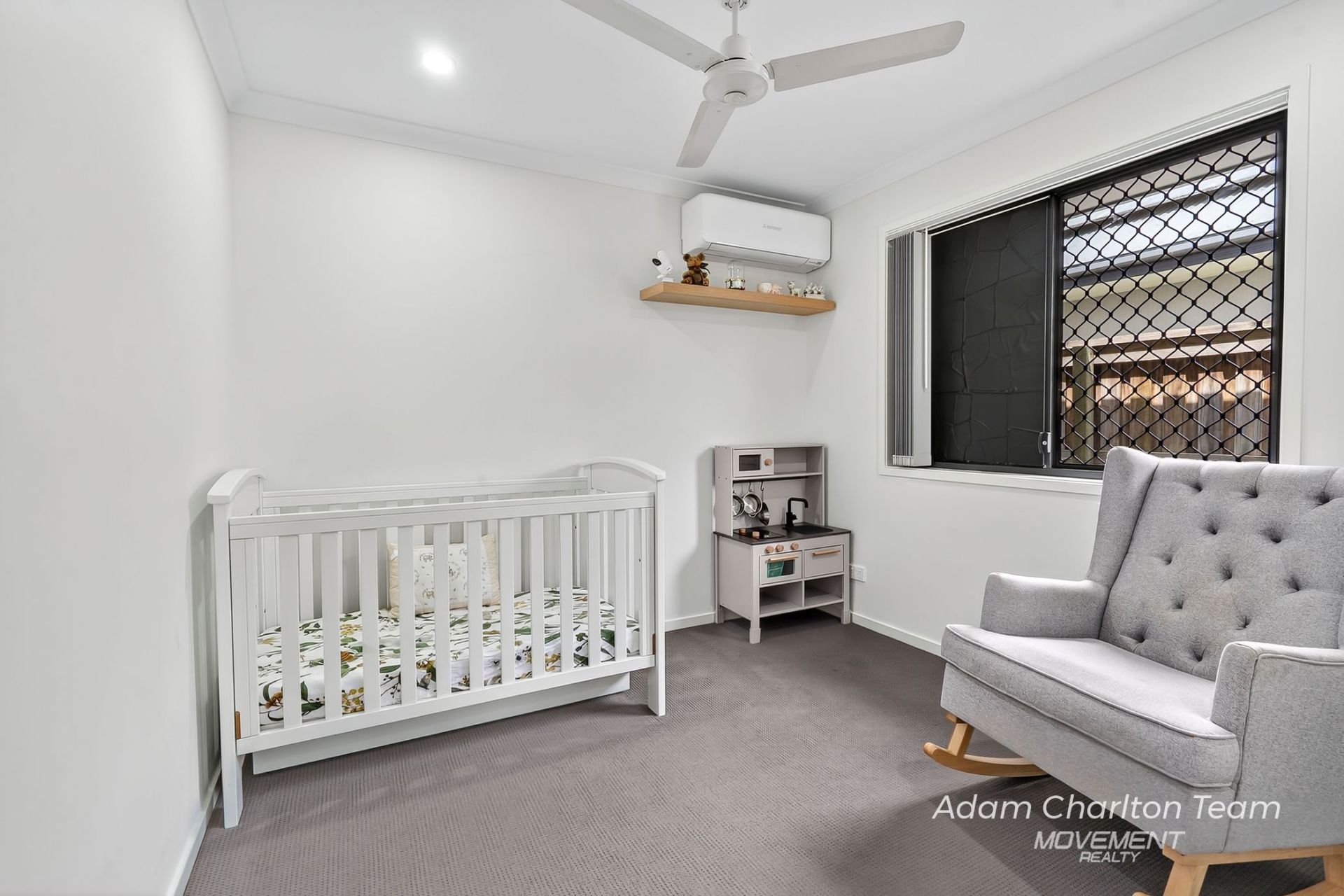 The air-conditioned lounge cools the open-plan living zones, while ceiling fans throughout ensure comfort in every room. Each bedroom is fitted with built-in robes, while the master suite offers a private ensuite and air conditioning. The nursery bedroom also benefits from air conditioning, ensuring comfort for the whole family. The main bathroom caters perfectly to family needs, with a separate bath and shower.