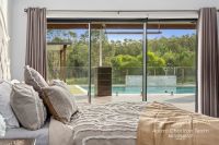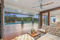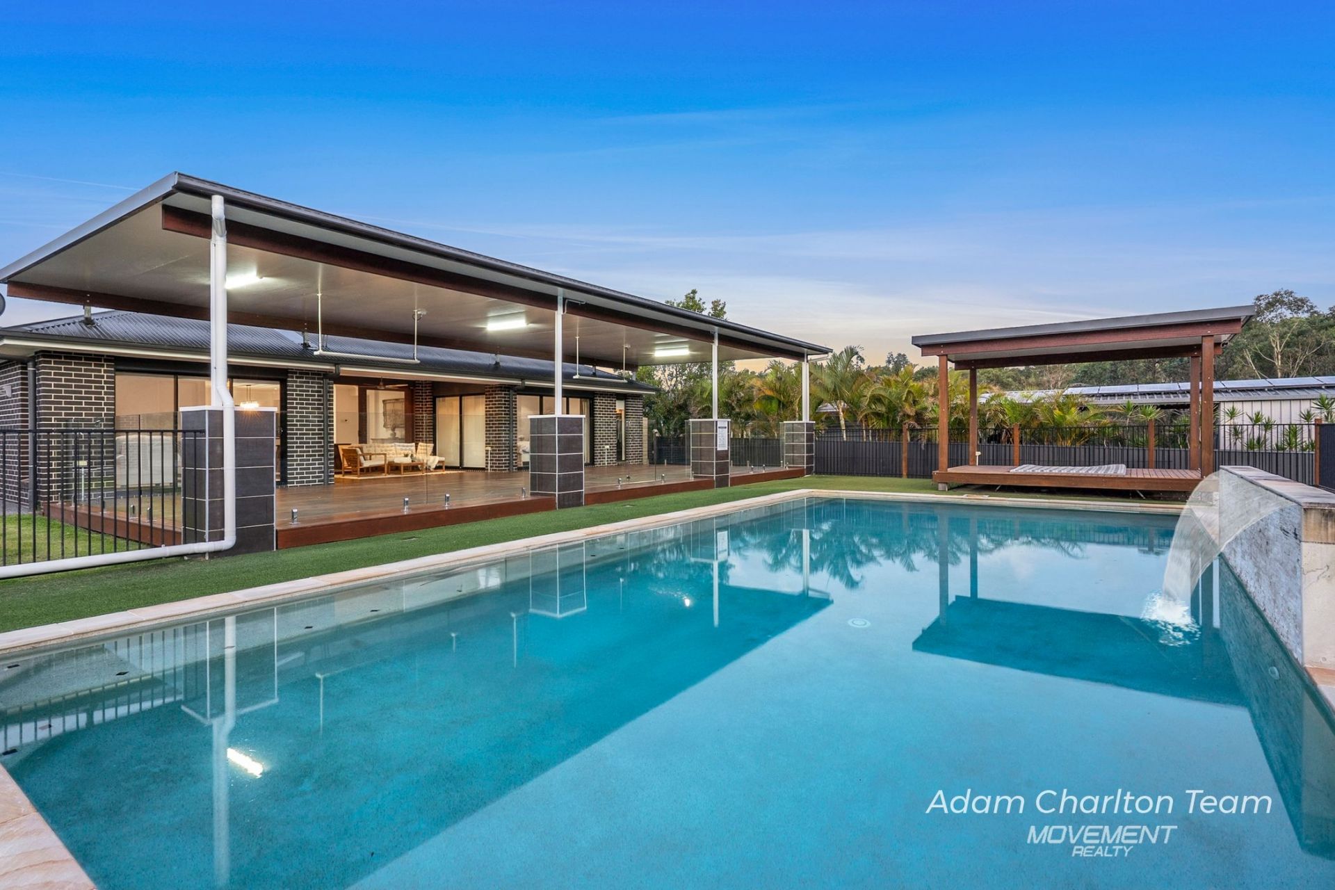 The impressive inground saltwater pool with stone waterfall is framed by sleek glass fencing, allowing uninterrupted views while enjoying the outdoors. A covered outdoor room next to the pool provides shade and a comfortable spot to soak up the summer days.