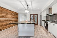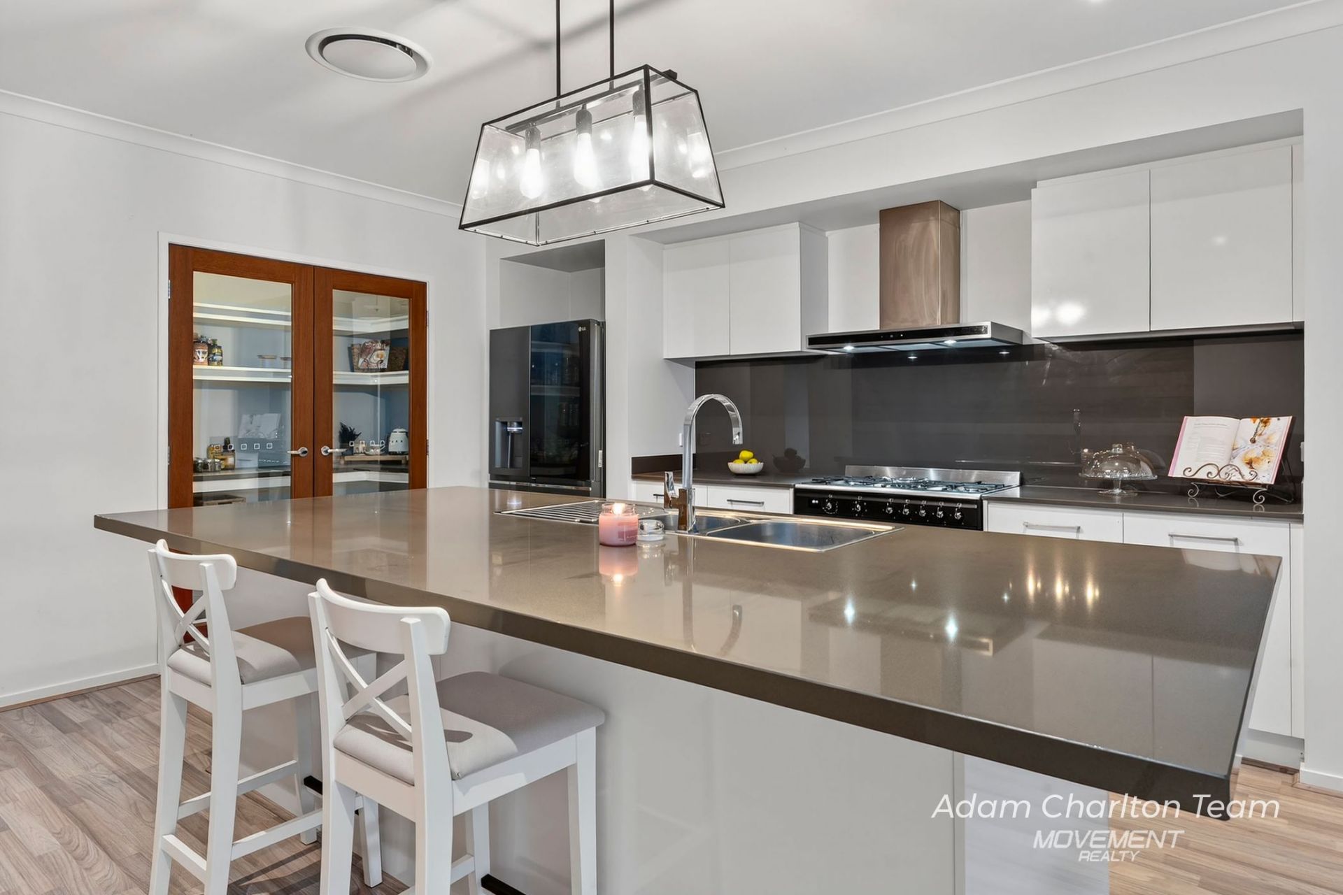 - Designer kitchen with oversized stone island, pendant lighting, and walk-in pantry