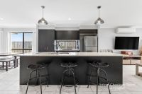 The heart of the home is the open-plan kitchen, dining, and living area, which is air-conditioned for year-round comfort. The kitchen is stylish and functional, featuring stone benchtops, a breakfast bar, 600mm oven and cooktop, and a dishwasher, making it perfect for everyday living and entertaining. A separate media room offers an additional living space for family relaxation or movie nights.