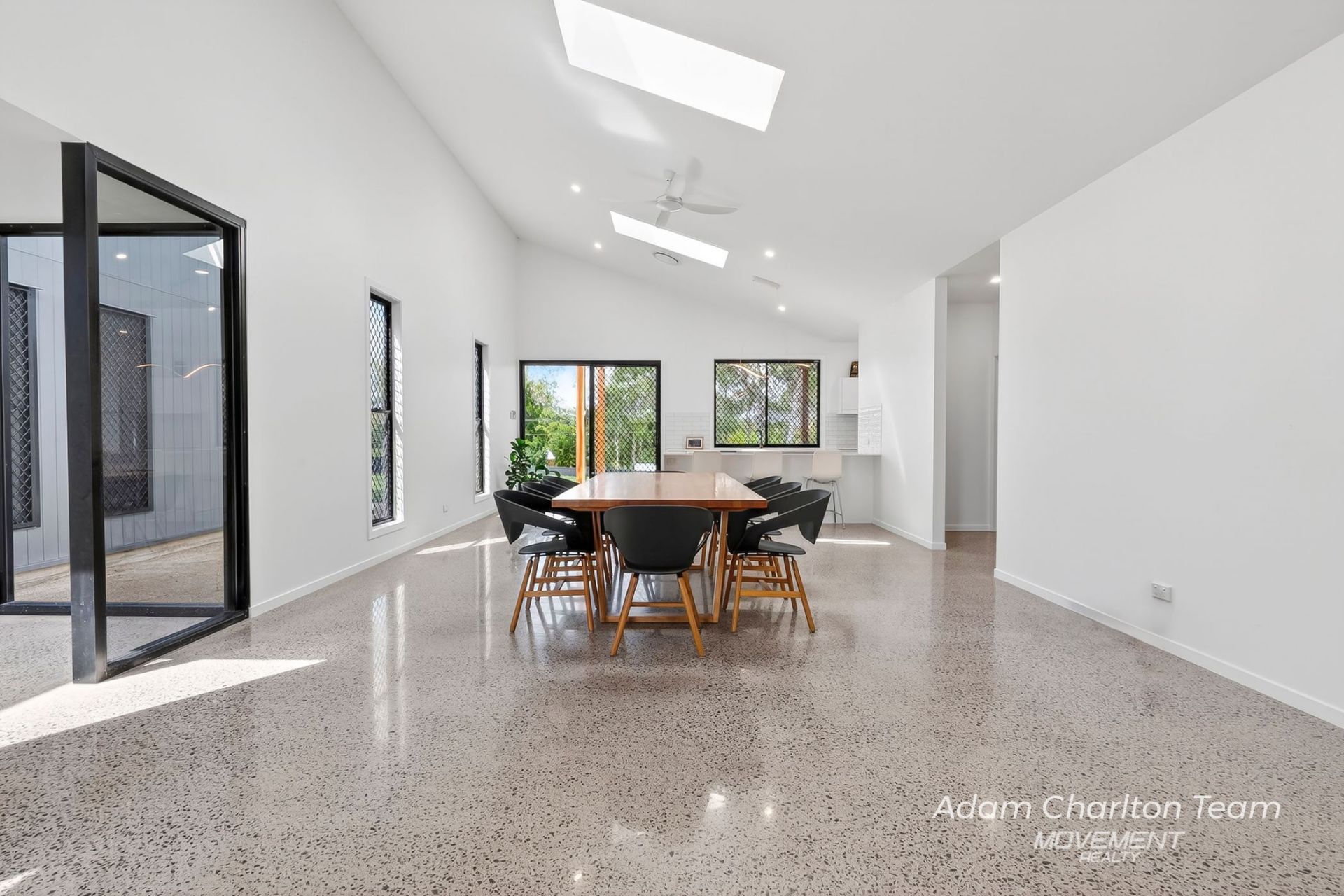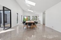 The home welcomes you with polished concrete flooring throughout, complementing the 2.7m high ceilings and a raked ceiling soaring to 4.3m in the main living and kitchen areas, creating an immediate sense of space and light. Every detail has been meticulously crafted, from the square set finishes throughout to the custom joinery built-to-ceiling in every bedroom, ensuring style meets practicality at every turn.