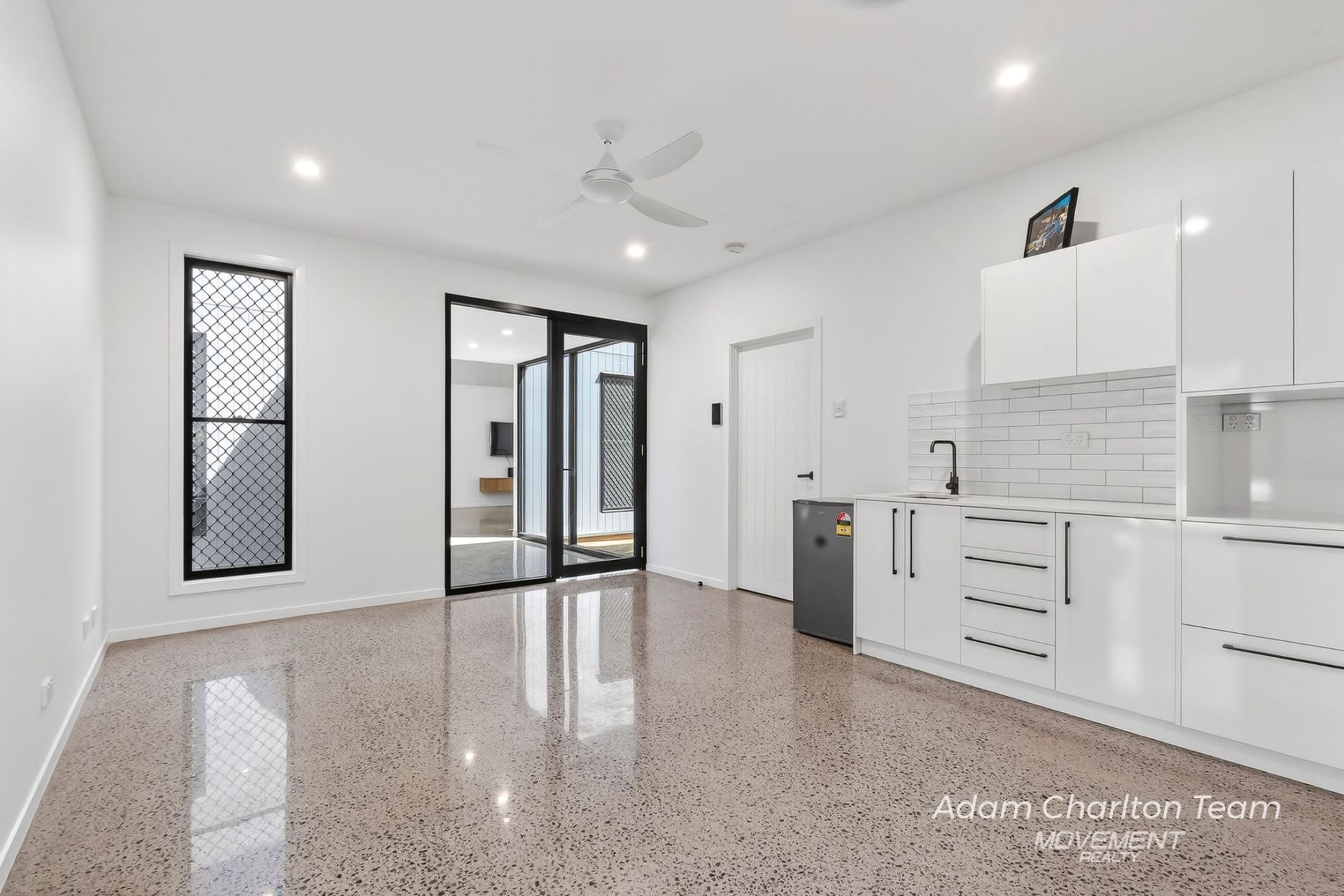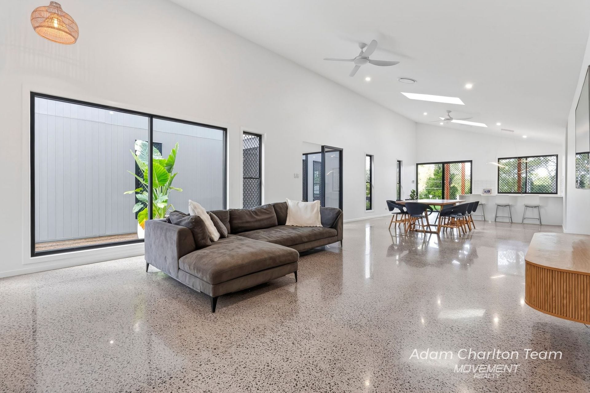Polished concrete flooring throughout