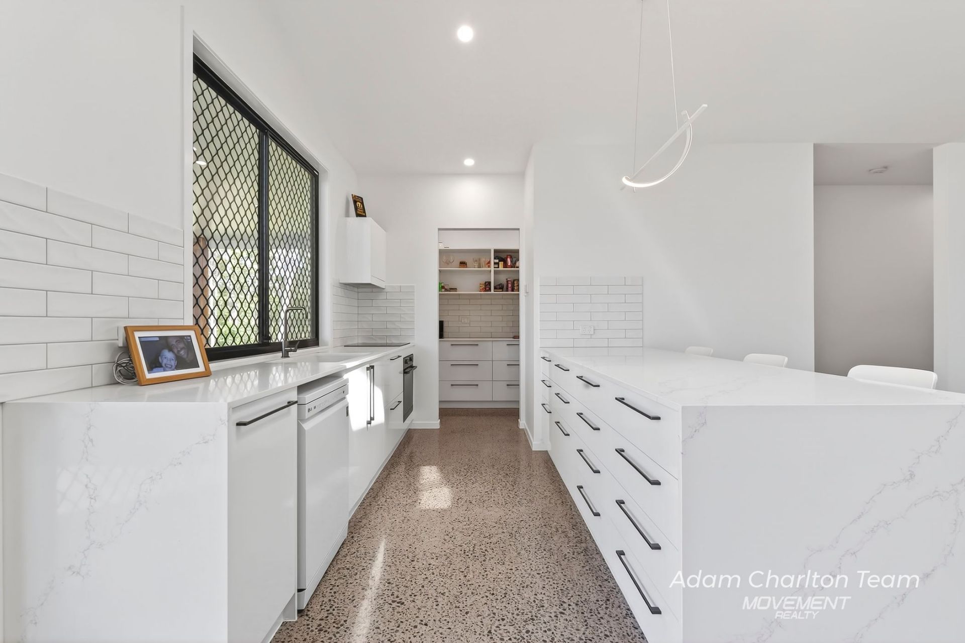 Stone benchtops throughout with waterfall ends to kitchen and island bench