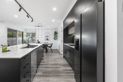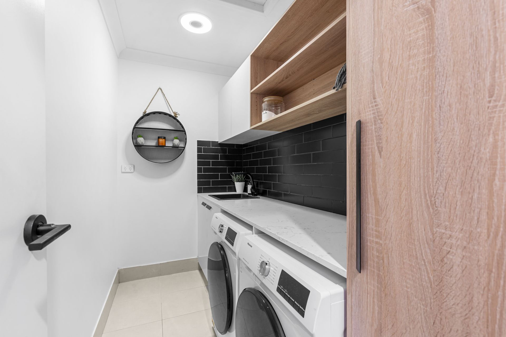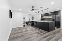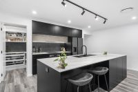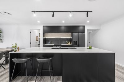 The monochromatic theme seamlessly ties the entire house together, creating a sophisticated and cohesive atmosphere. The heart of this home is the high-end 2pac kitchen, featuring a Xenolith benchtop with a color-coded PowerPoint on the end, an Arete Stone custom black double bowl sink, and a breathtaking one-piece Italian stone splashback. Culinary enthusiasts will appreciate the induction cooktop, pyrolytic Westinghouse oven, and automatic range hood. The grand island bench not only adds a touch of grandeur but also provides ample bench space and storage, complemented by cabinets to the rear and a walk-in pantry with additional drawer space and storage.