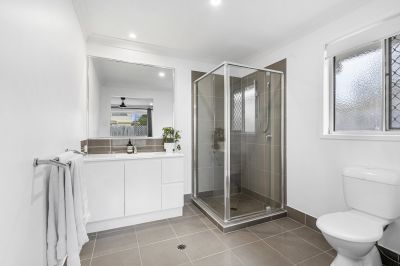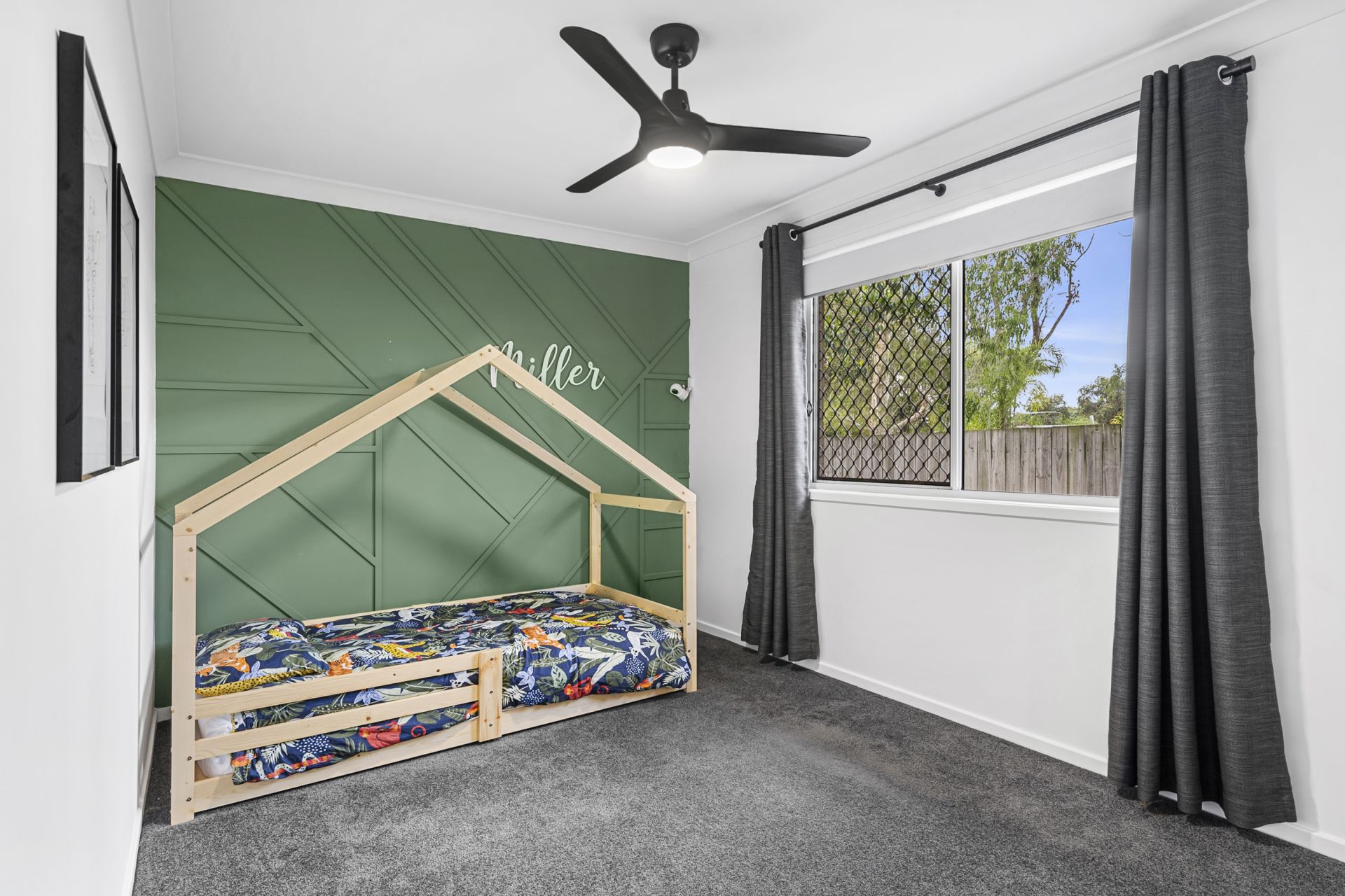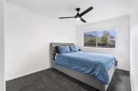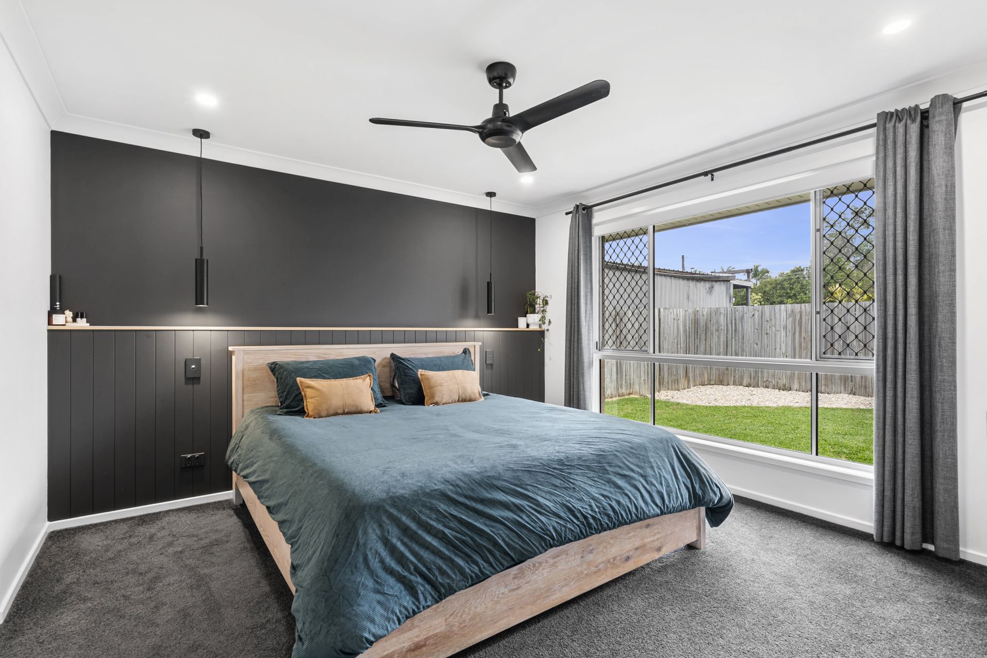 The master bedroom is a haven of luxury with a feature VJ wall and ledge, creating a focal point of elegance. All other bedrooms are well-appointed with roller blinds, ceiling fans, and spacious robes, ensuring both comfort and convenience.