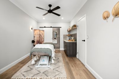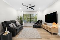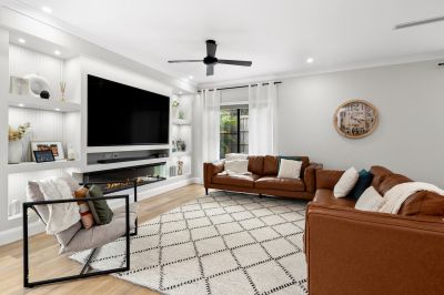 The open-plan living area is a true showstopper, anchored by a striking custom-built feature wall with built-in shelving, downlights, and a cozy fireplace. Black feature lighting and ceiling fans add a modern sophistication, perfectly complementing the home's contemporary aesthetic. Designed for both relaxation and entertaining, the lower level also includes a dedicated media/lounge area, a private study, and a versatile studio with its own ensuite. With private external access, this space is ideal as a secondary master suite for extended family, guests, or even as a self-contained retreat.