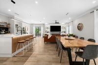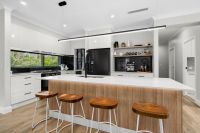 At the heart of the home lies a spacious and thoughtfully designed kitchen, complete with ample bench space, abundant cabinetry, and an array of pot drawers to ensure effortless storage. A 900mm gas cooktop makes meal preparation a delight, while a dedicated coffee and tea nook adds an extra touch of convenience. The generous butler’s pantry, featuring an undermount sink and premium plumbing fittings, enhances both practicality and style.