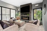 Entertainment Area 9905 x 4.8m Tiled patio with 2 x ceiling fans, electric fireplace and feature wall