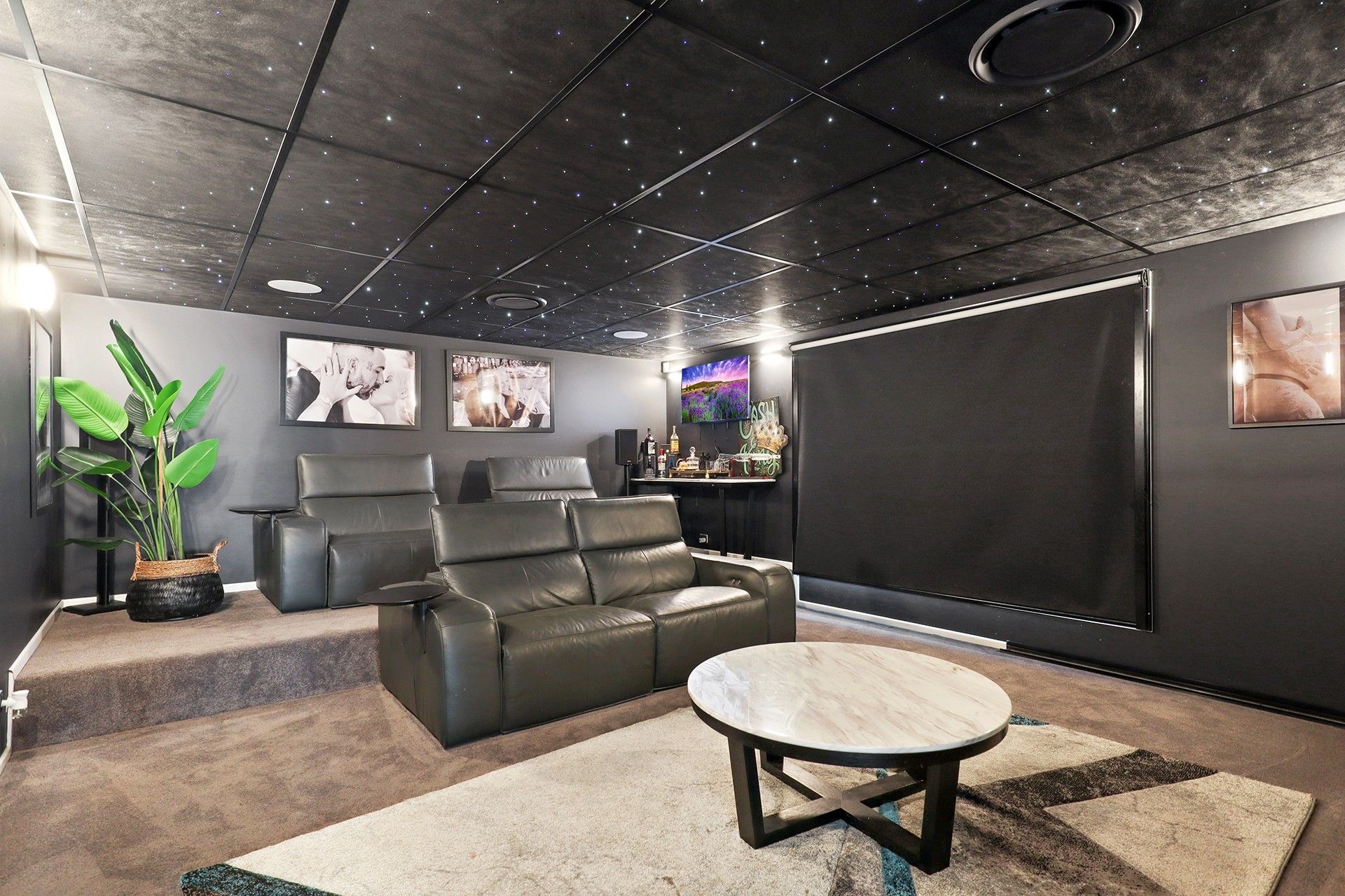 Blacked out theatre room with acoustic panel ceiling with star feature lighting