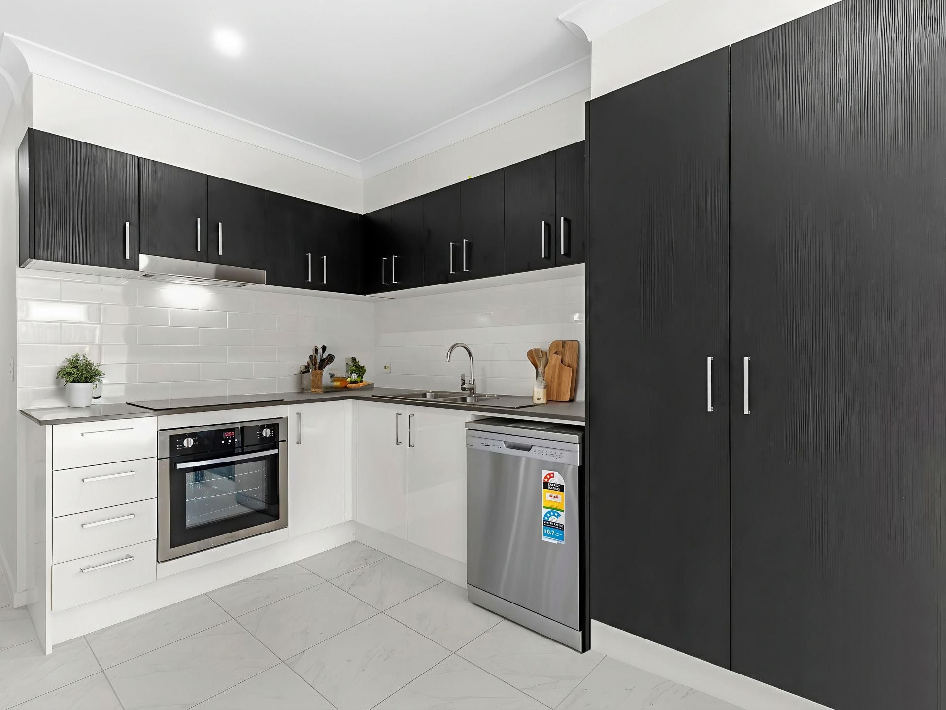 Modern kitchen equipped with cabinetry, durable stone benchtops, stainless steel appliances, gas cooktop, and a convenient dishwasher