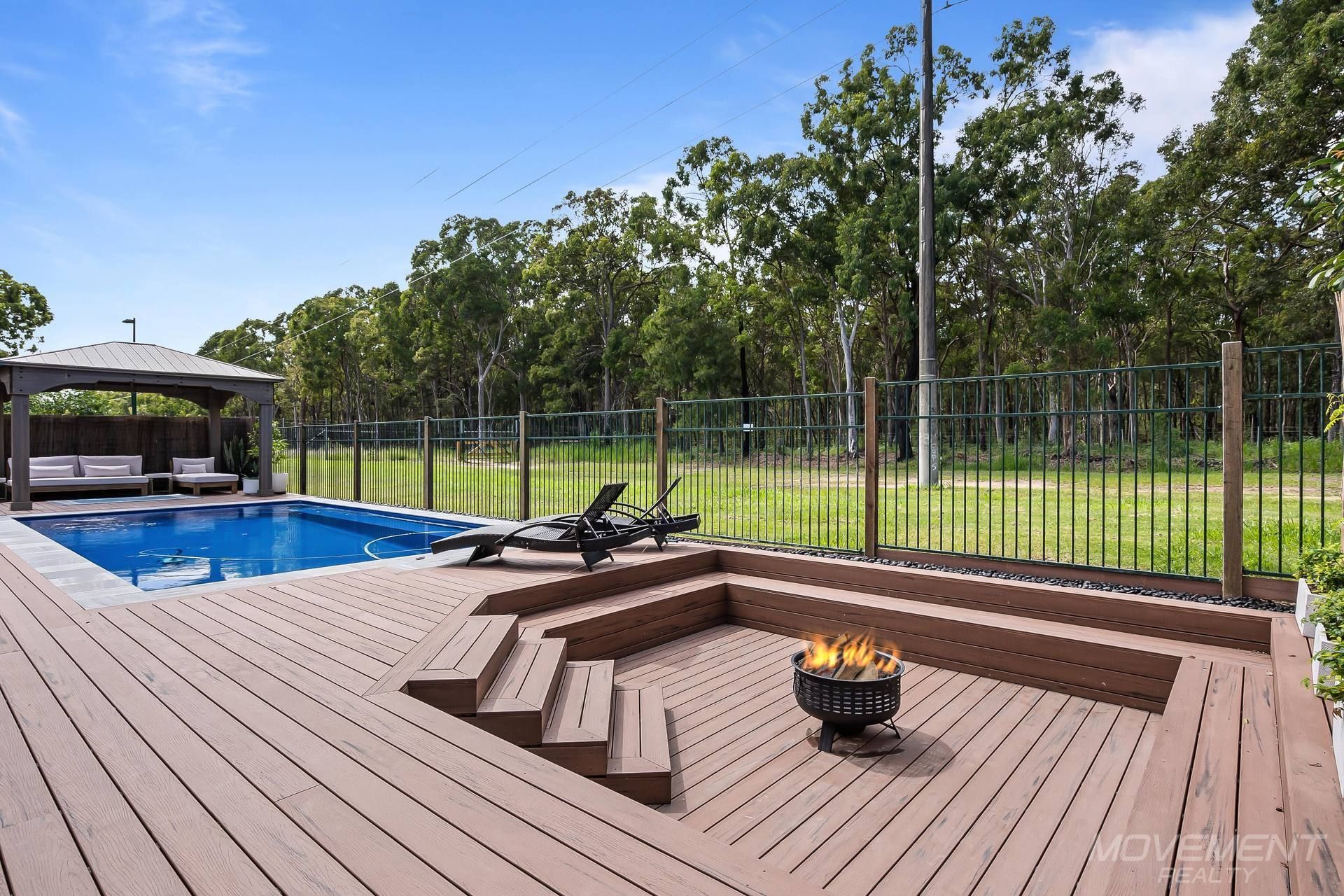 Outside, the property presents a unique outdoor sanctuary, with an abundance of eco decking providing the perfect setting for alfresco living. A sunken fire pit area, complete with bench seats, sets the scene for memorable gatherings under the stars, while a picturesque free hut overlooks the stunning 8x4 in-ground magnesium pool. With no neighbours to the rear and one side of the property, privacy is assured, allowing you to enjoy your own private oasis in complete serenity.