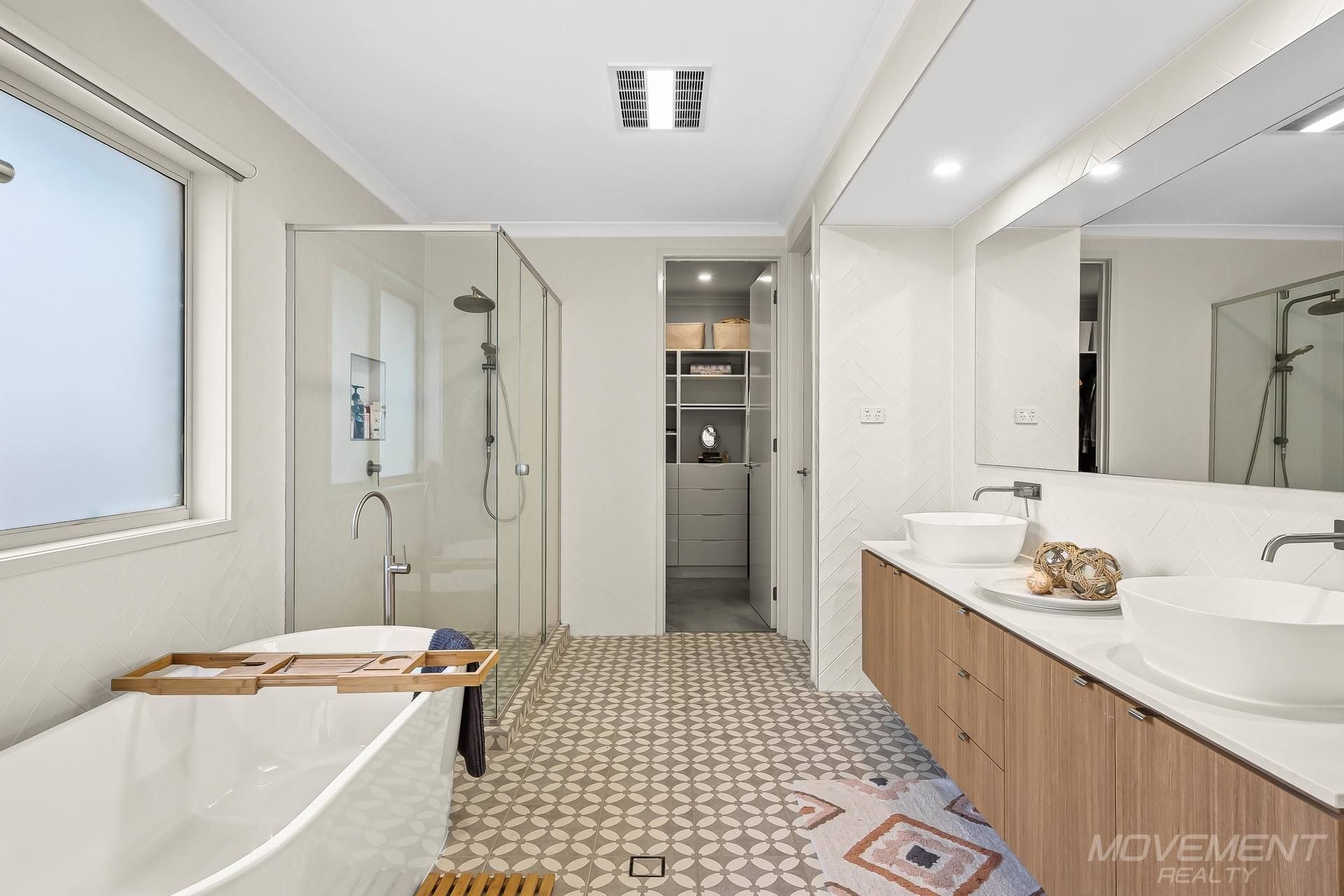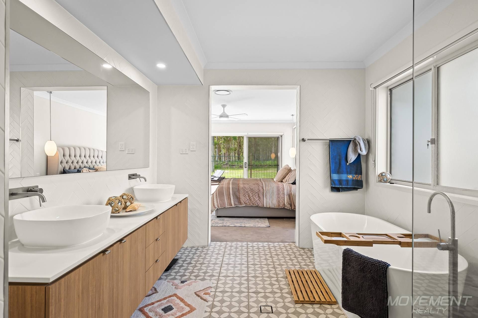 The well-considered floor plan positions the luxurious master suite at the opposite end of the house from the additional three bedrooms, providing ultimate privacy. The master bedroom boasts a spacious layout and a stylish ensuite complete with a dual basin vanity, freestanding bathtub, and exquisite full-height herringbone tiling. Encaustic floor tiles add a touch of flair to this serene retreat, which also features a sliding stacker door providing direct access to the expansive eco deck at the rear of the residence.