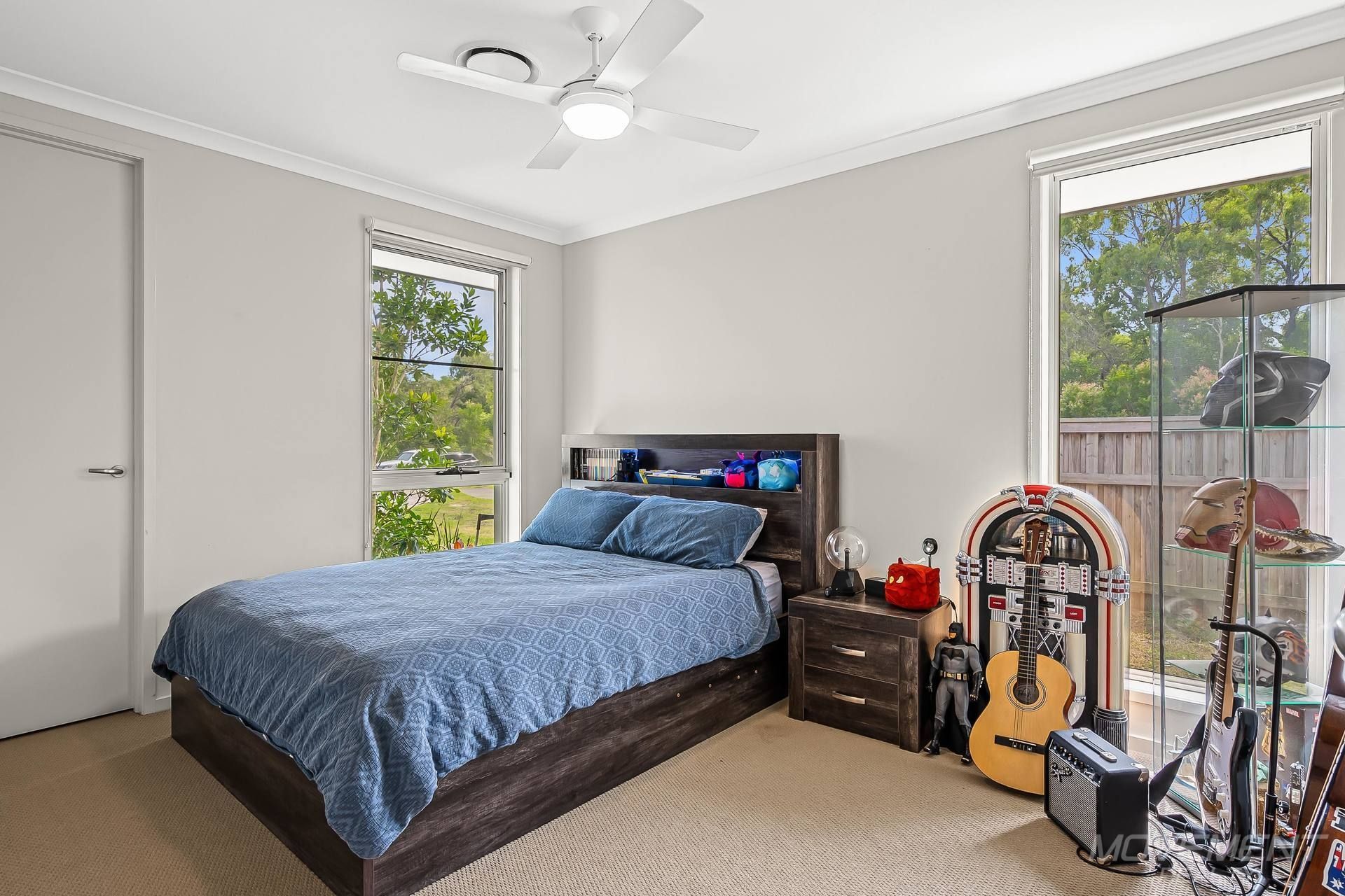 The remaining three bedrooms are generously sized, with two offering walk-in robes and the third featuring a sliding door robe. Each bedroom is flooded with natural light through elongated windows and equipped with ceiling fans for year-round comfort.