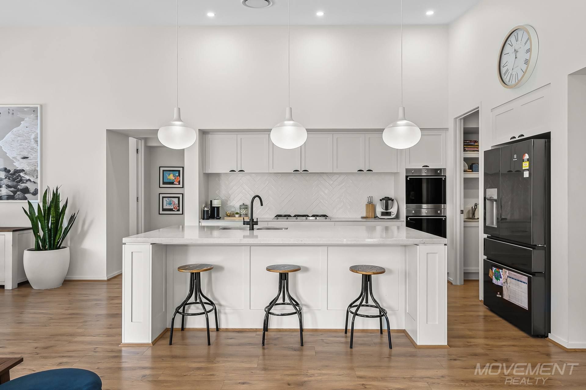 The heart of the home lies in its impressive open-plan kitchen and living area, where a striking raked ceiling reaches a height of 3.7m at its zenith. The chef-inspired kitchen is a culinary delight, featuring shaker-style cabinetry, premium appliances, and lavish 40mm stone benchtops. A large butler's pantry provides ample storage, while a filtered water flick mixer tap adds convenience to daily tasks. Adorned with a stunning herringbone splashback, the kitchen seamlessly complements the neutral theme that flows throughout the home.