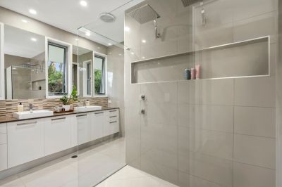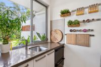 - The kitchen features a porcelain tiled splash back, 50mm waterfall stone benchtops, drop sinks in the kitchen and butler's pantry, soft-close cabinetry, a Zip tap for instant boiling or chilled water, a plumbed-in fridge, a 2-drawer Fisher and Paykel dishwasher, induction cooktop, and Vacuum Maid.