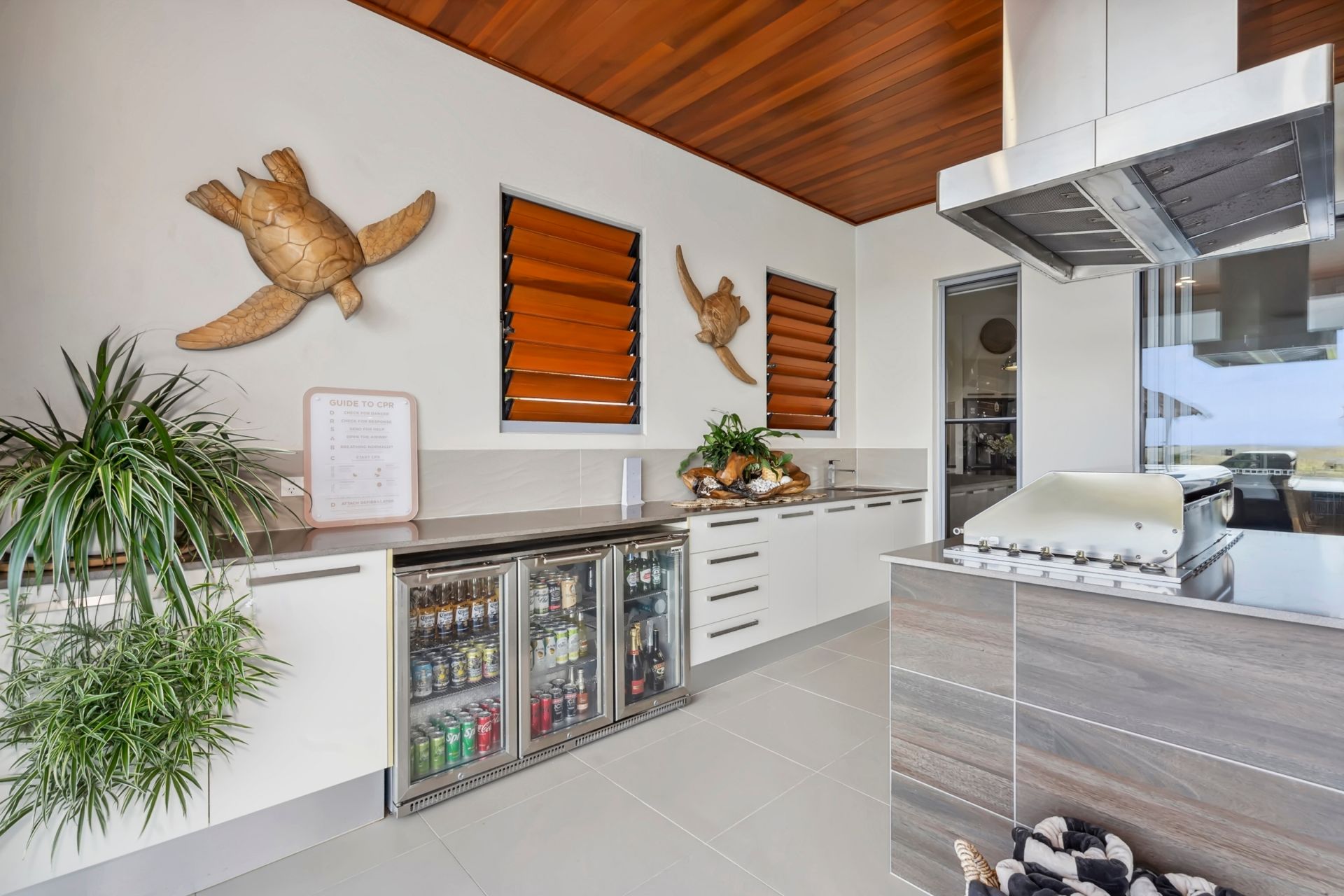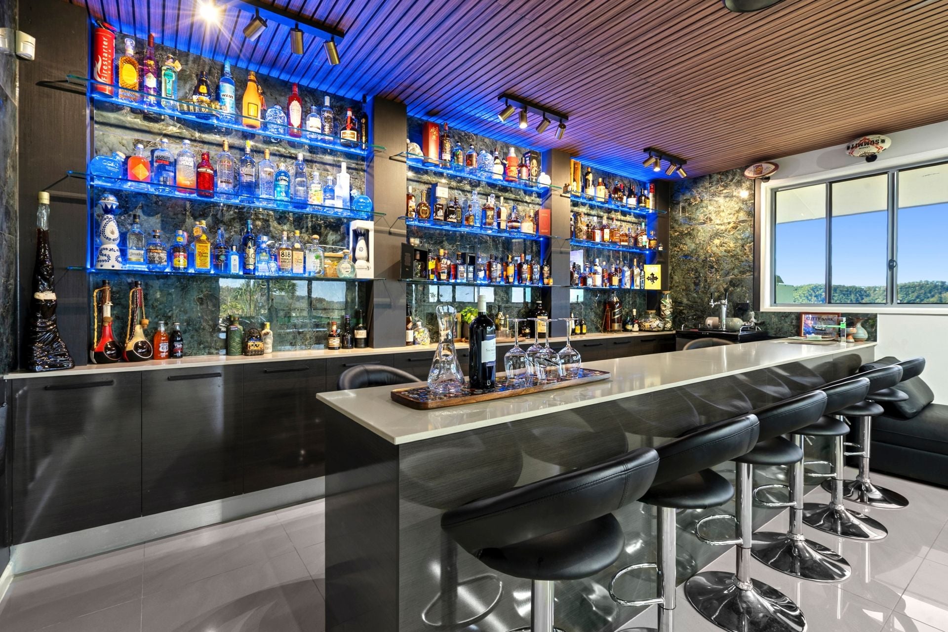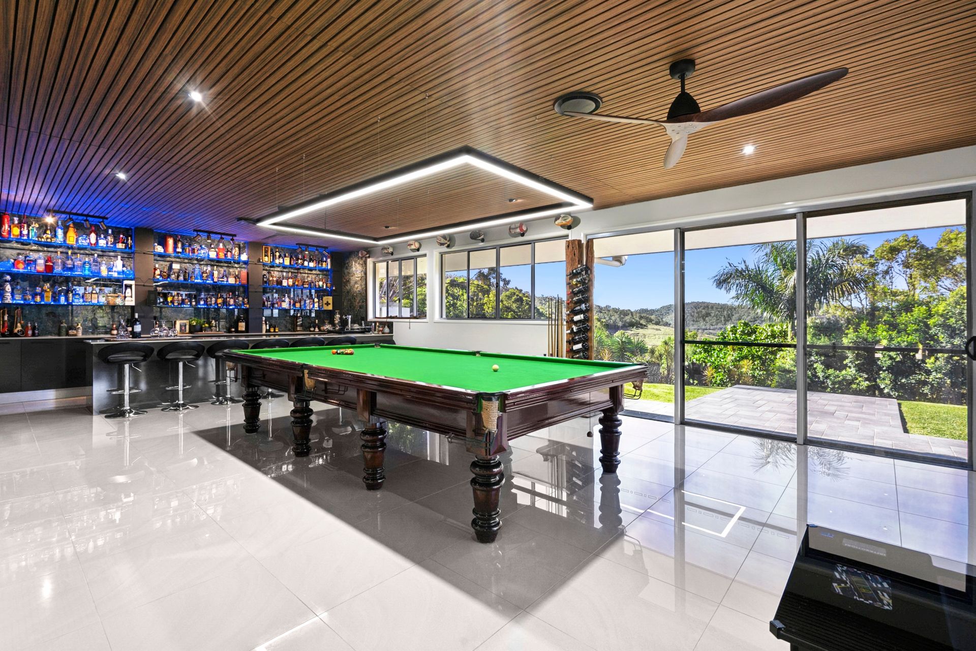 - Gaming room includes a bar with a built-in fridge, soft-close cupboards and drawers, and stacker doors that open to the outside.