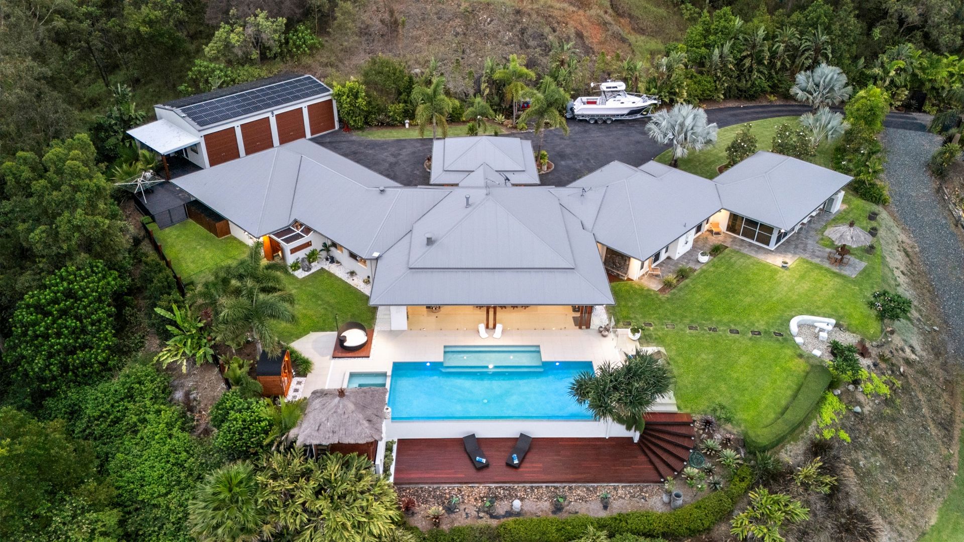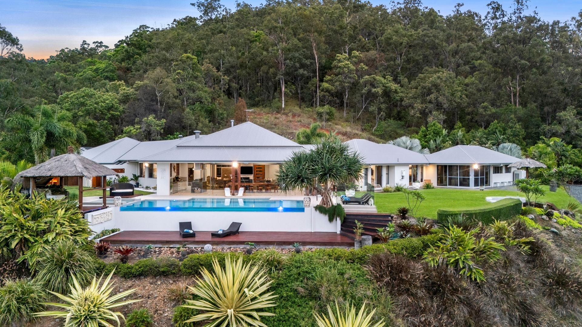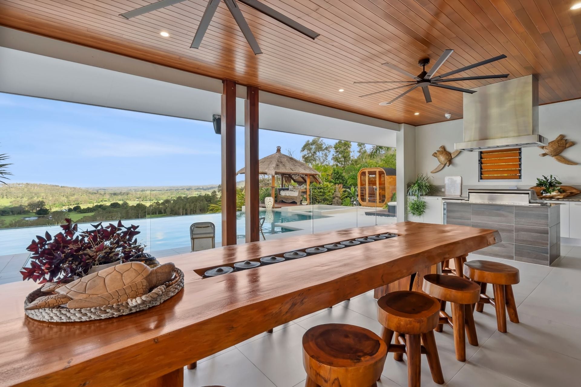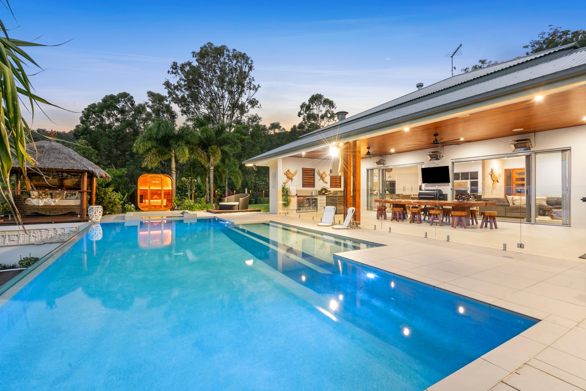 - The 12x6m infinity-edge pool, complete with lighting and a Vikara Sauna, is a stunning centerpiece, surrounded by a Balinese hut and decked lounge areas.