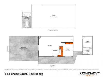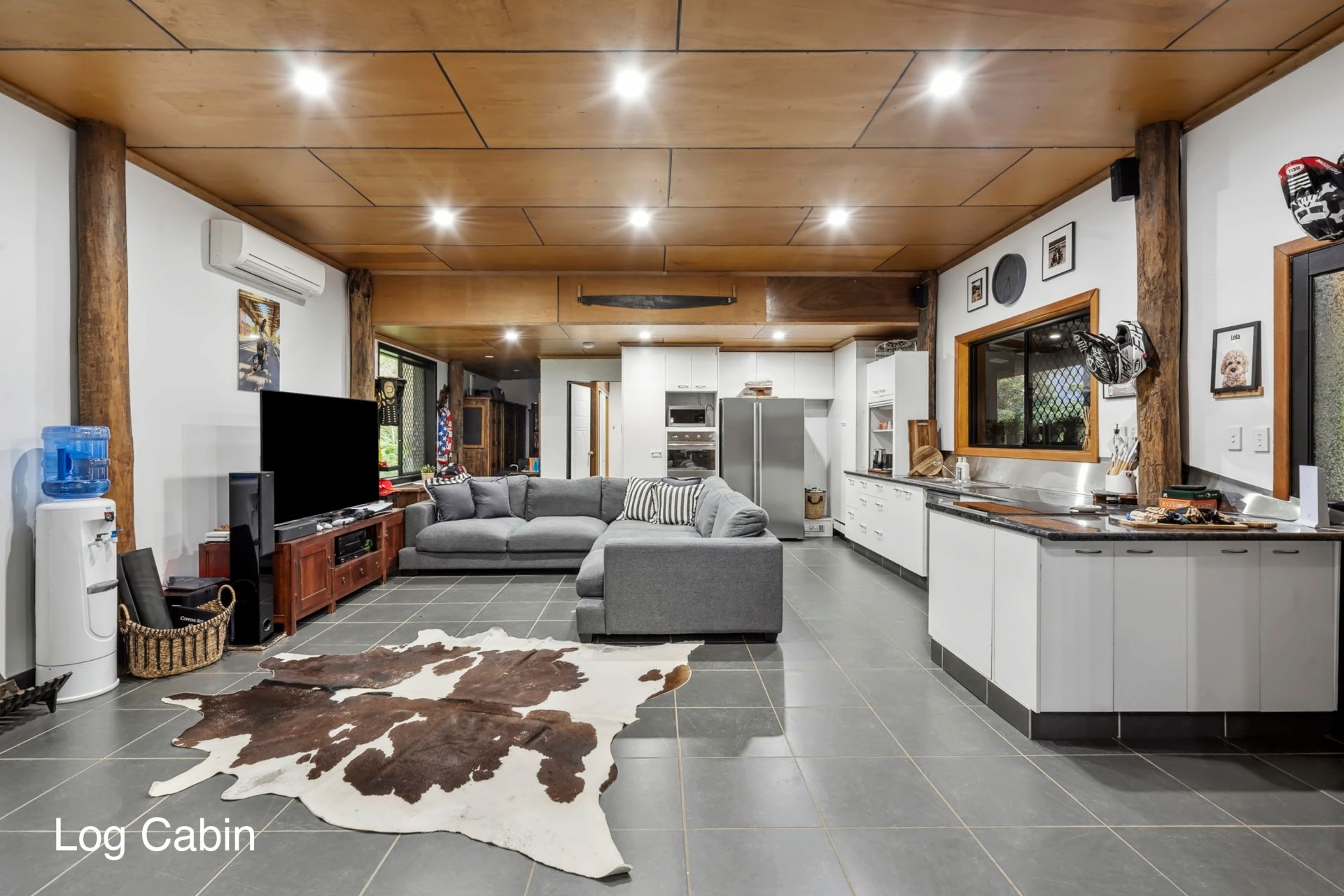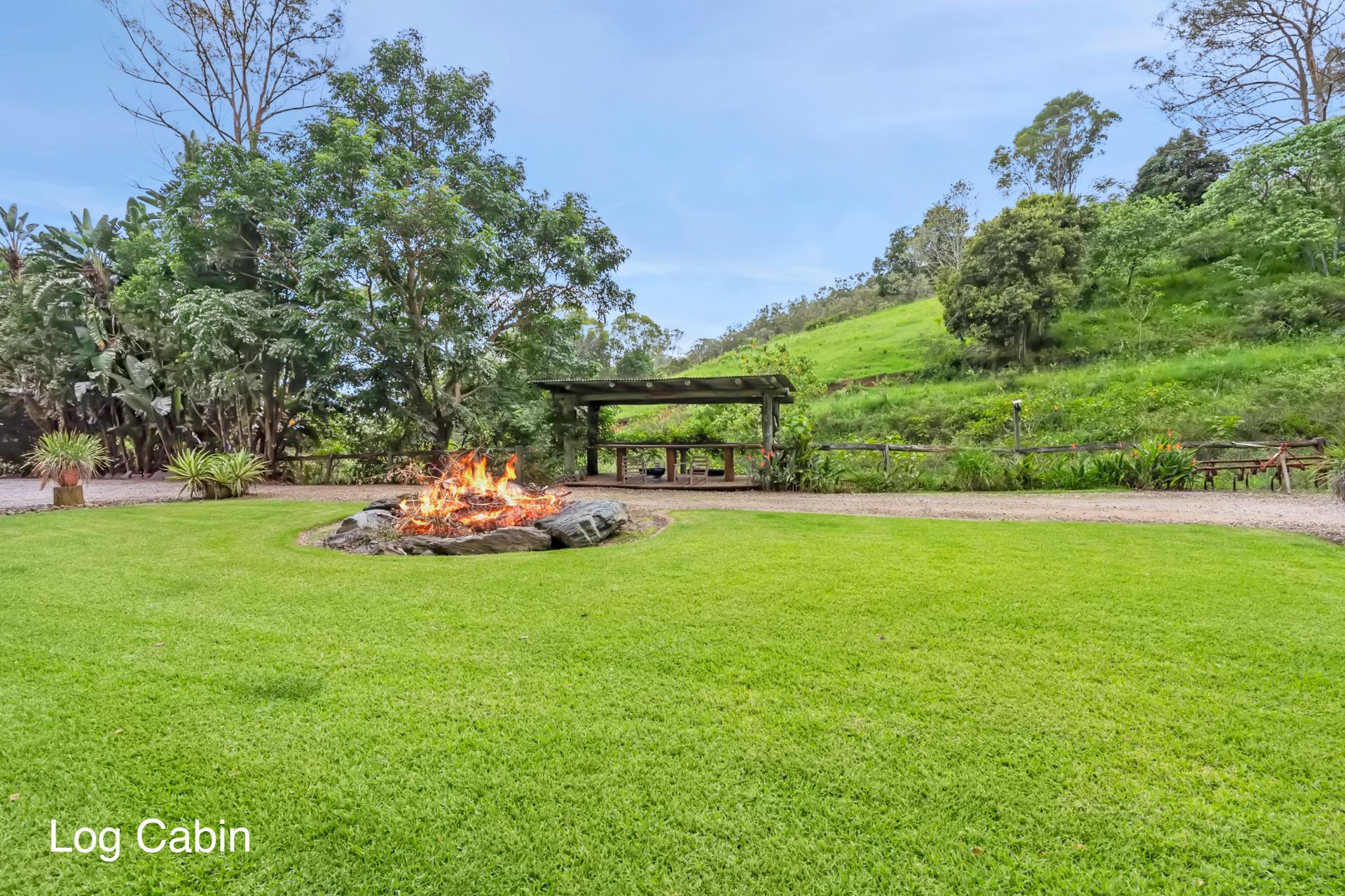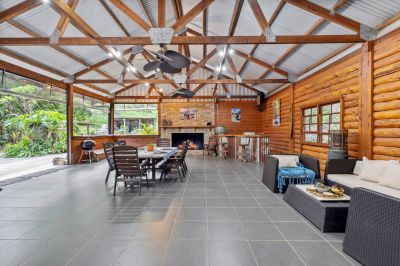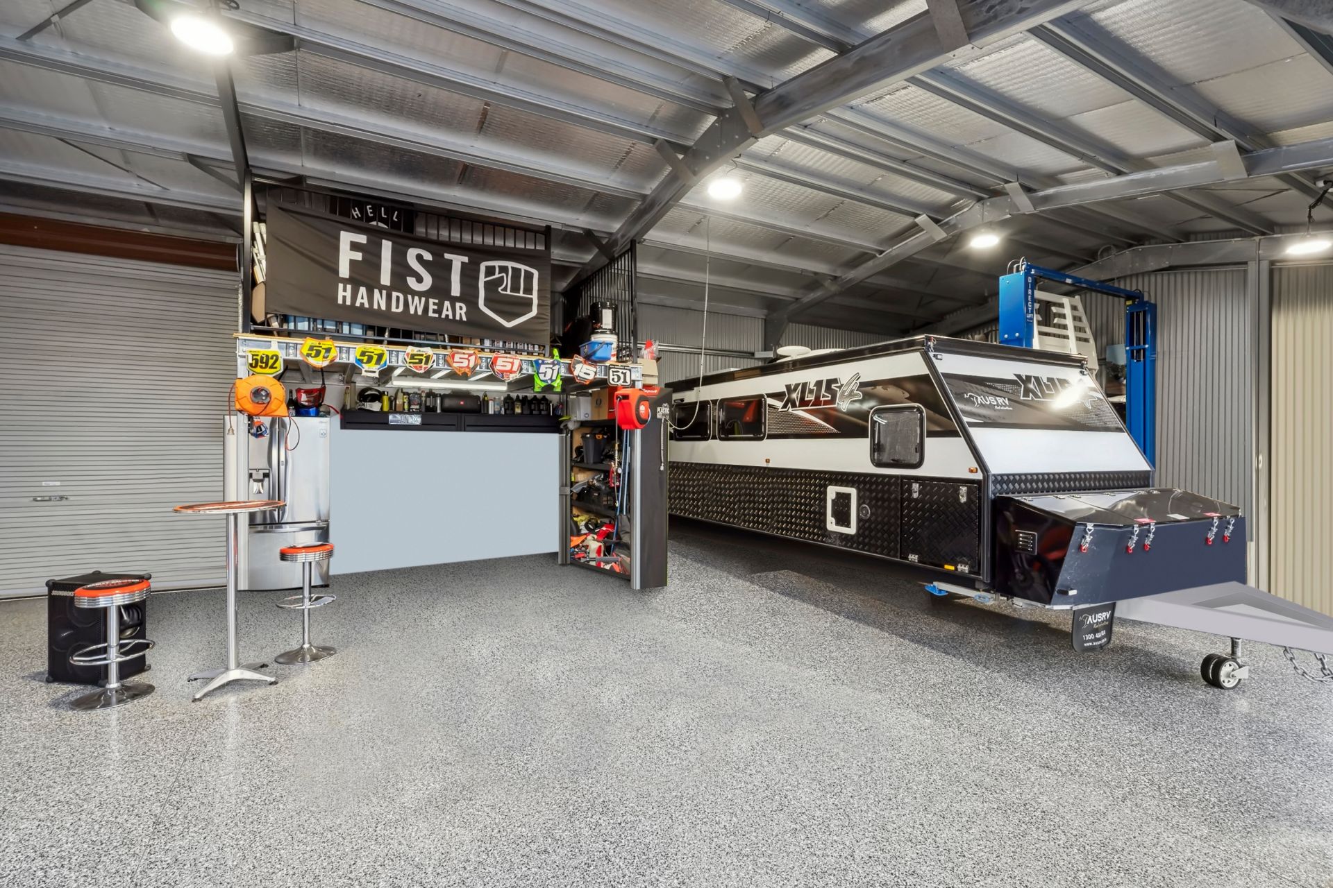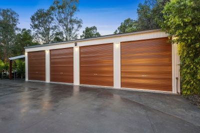 - A 4-bay shed with an attached carport, a tank on the side, a bike workshop with a bike hoist and car hoist, a 15-amp power system for a caravan, five electric roller doors with 4.2m clearance, an outdoor workers' bathroom and bar area in the carport, full insulation, epoxy flooring, and a back roller door that leads directly to the Log Cabin.