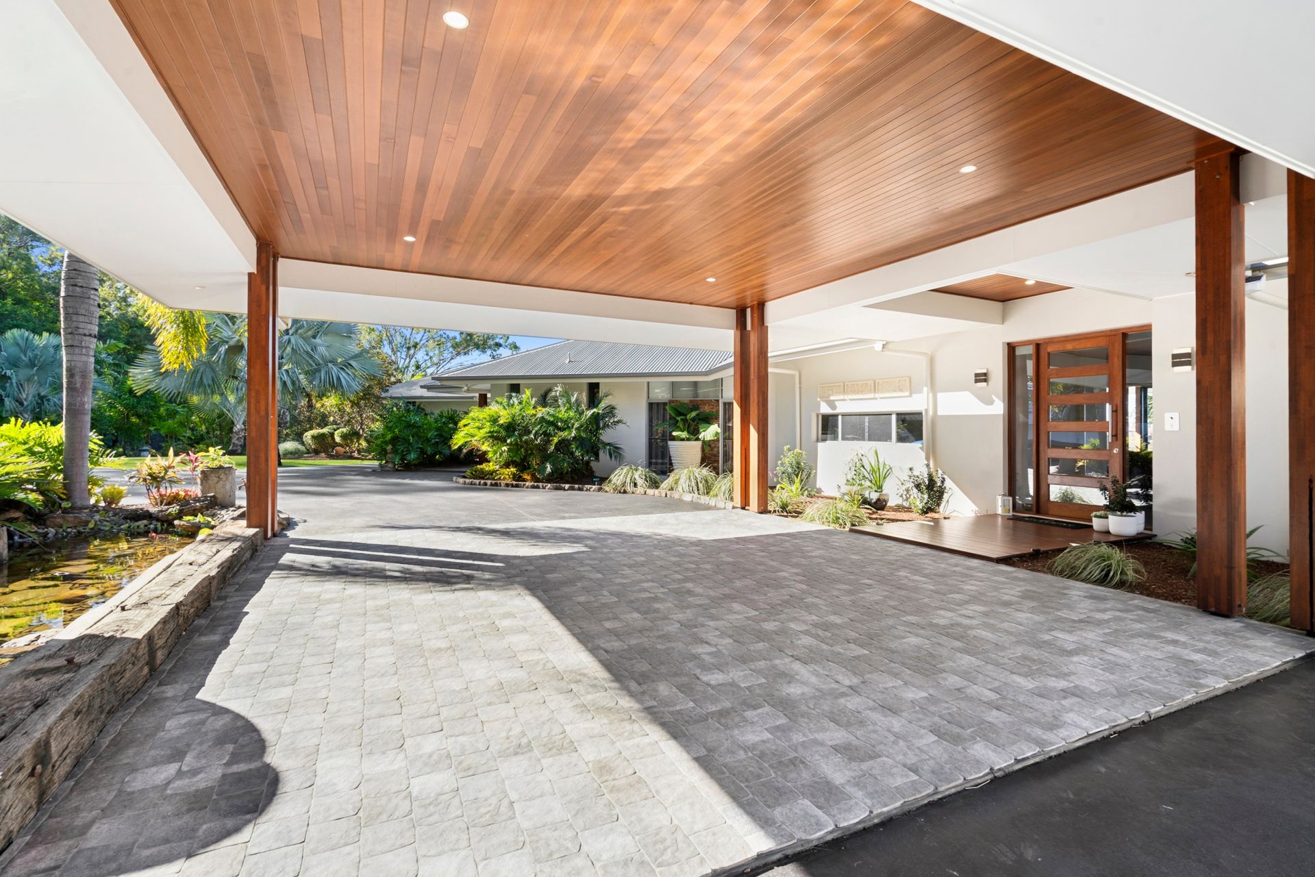 - The entrance is marked by double electric-controlled gates, coloured concrete with ample space for cars, caravans, and boats, well-established gardens, a rock bar, a fishpond with a water feature, and a porte cochère.