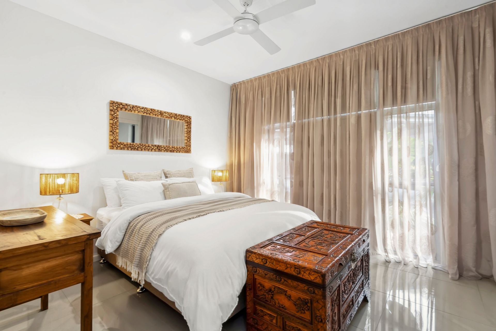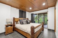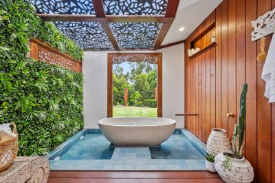 - The master bedroom features an ensuite with double shower heads and his and hers double sinks, a walk-in wardrobe with ample storage, and access to an enclosed outdoor bath haven, complete with a deck and tiled moat around the pool, with sliding wooden doors opening to the outdoors.
