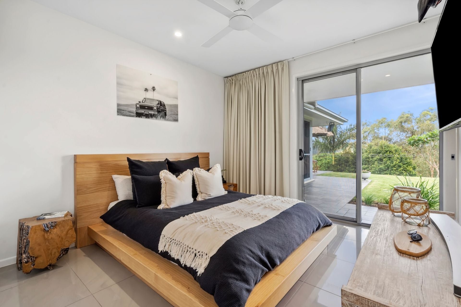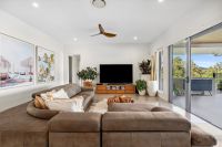 - Spacious living areas with a gas fireplace, bifold stacker doors opening to the outdoor entertaining area, and a concave ceiling fans provide the perfect space for family and guests