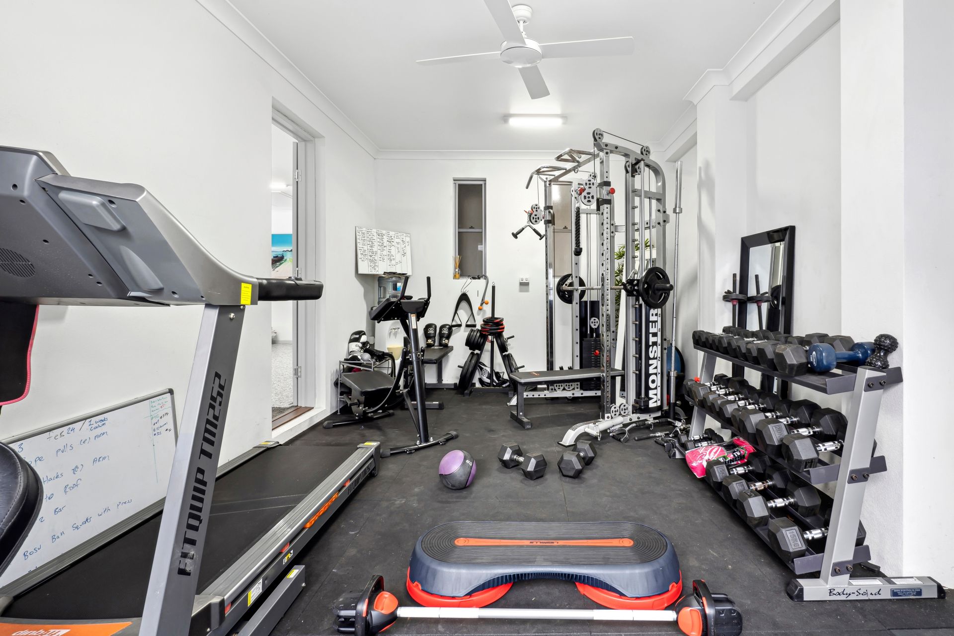 - The garage offers triple car space with electric roller doors, epoxy flooring, and internal access, leading to a gymnasium with an electric roller door to the outside, ample storage including an Adak with pull-down stairs, cupboards for additional storage, and an EV universal charging station.