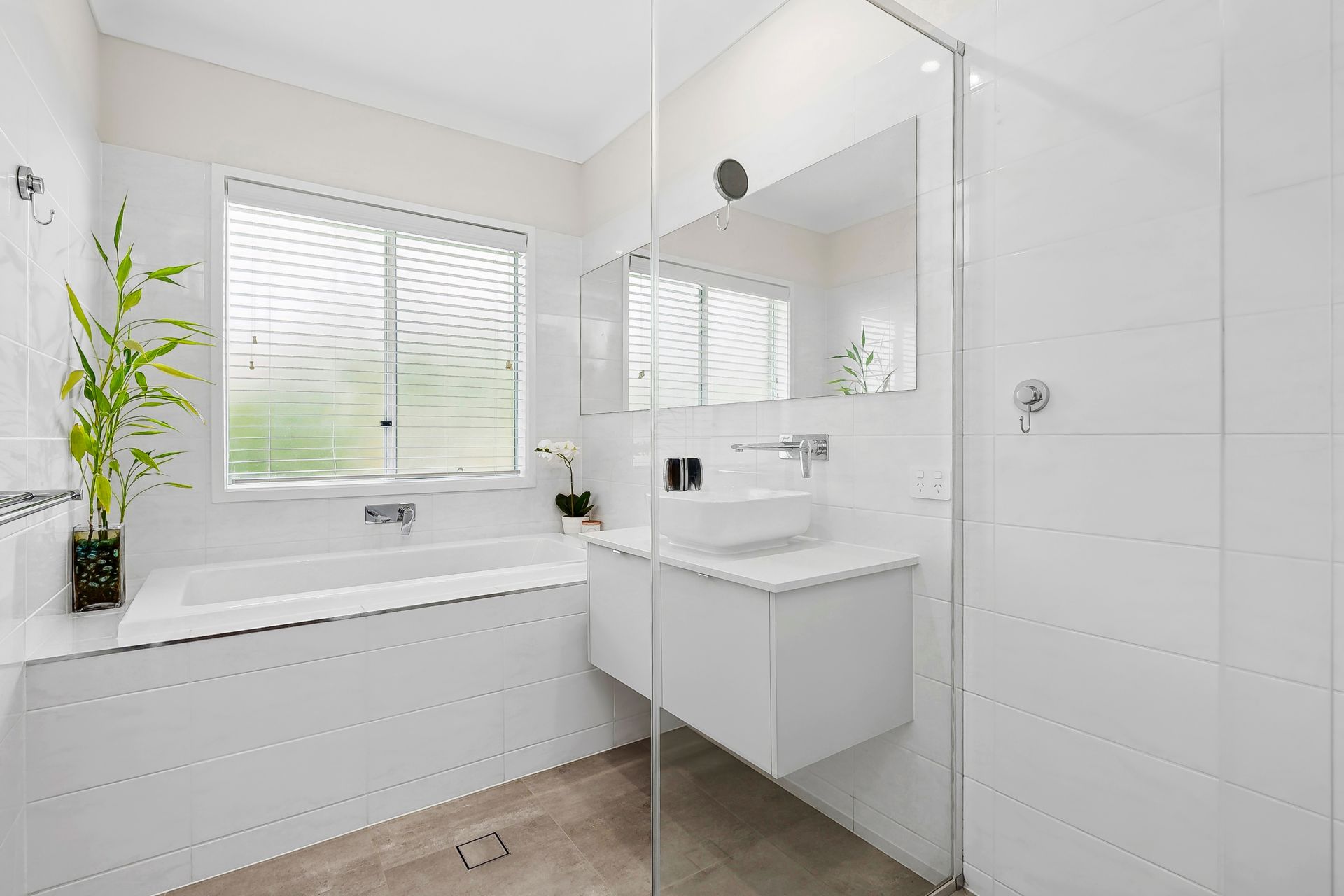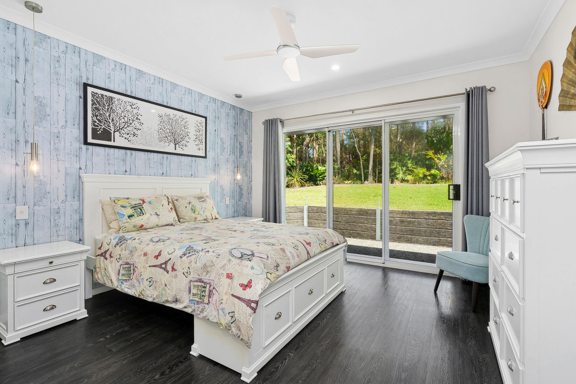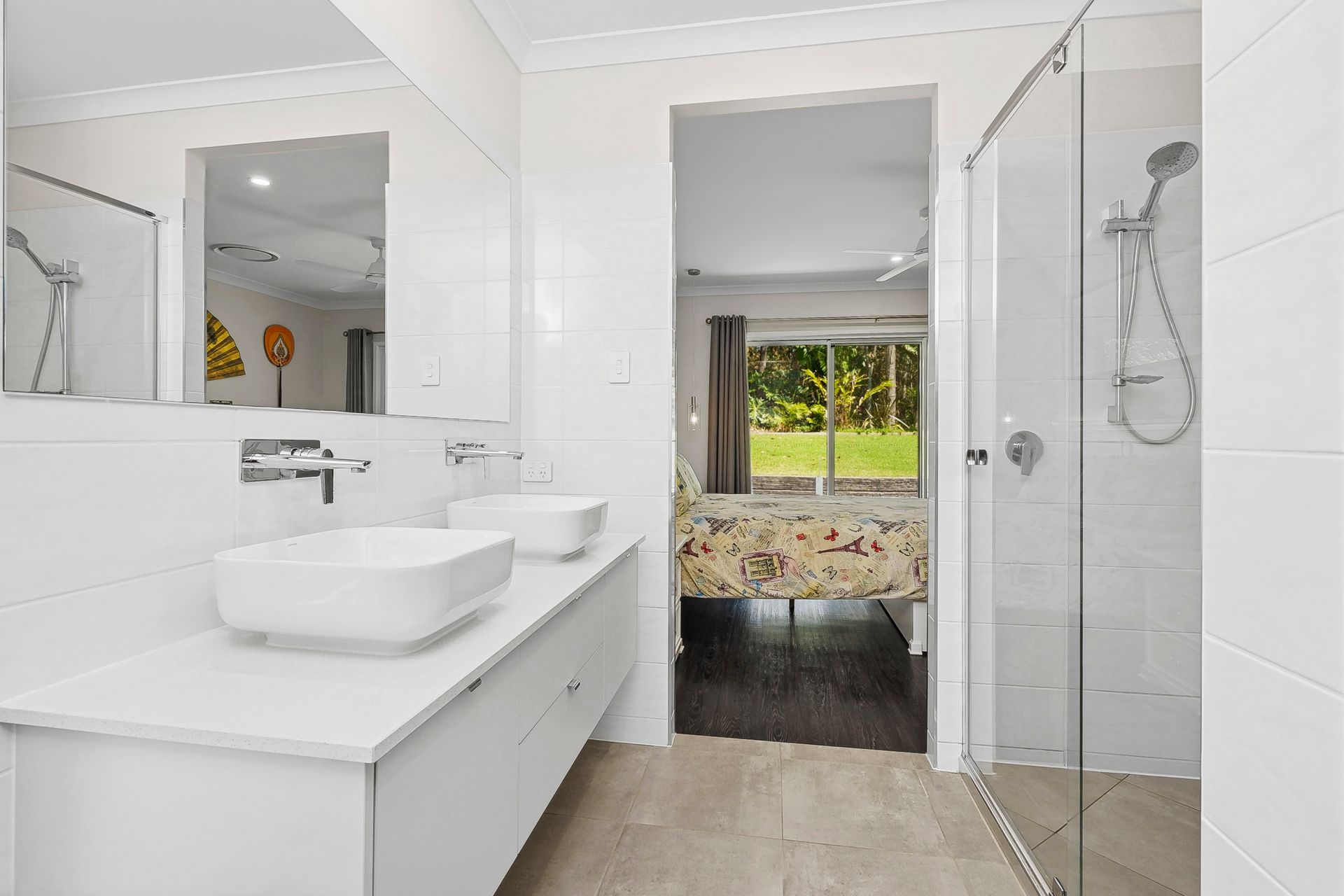 The master suite is a true sanctuary, positioned at the rear with tranquil views and access to the lush backyard. Complete with a large walk-through ensuite featuring dual basins, a spacious shower, and an impressive walk-in robe, this space is designed for ultimate relaxation. The three additional bedrooms are positioned at the front of the home, each with ceiling fans and built-in robes.
