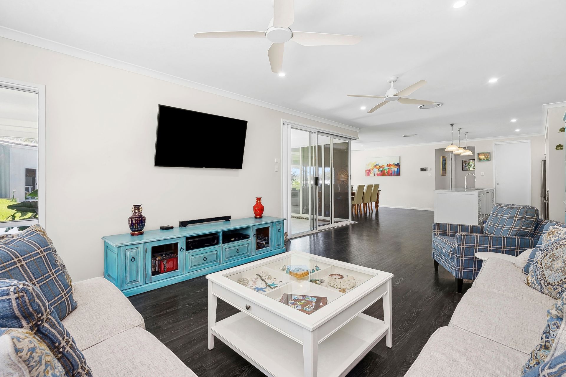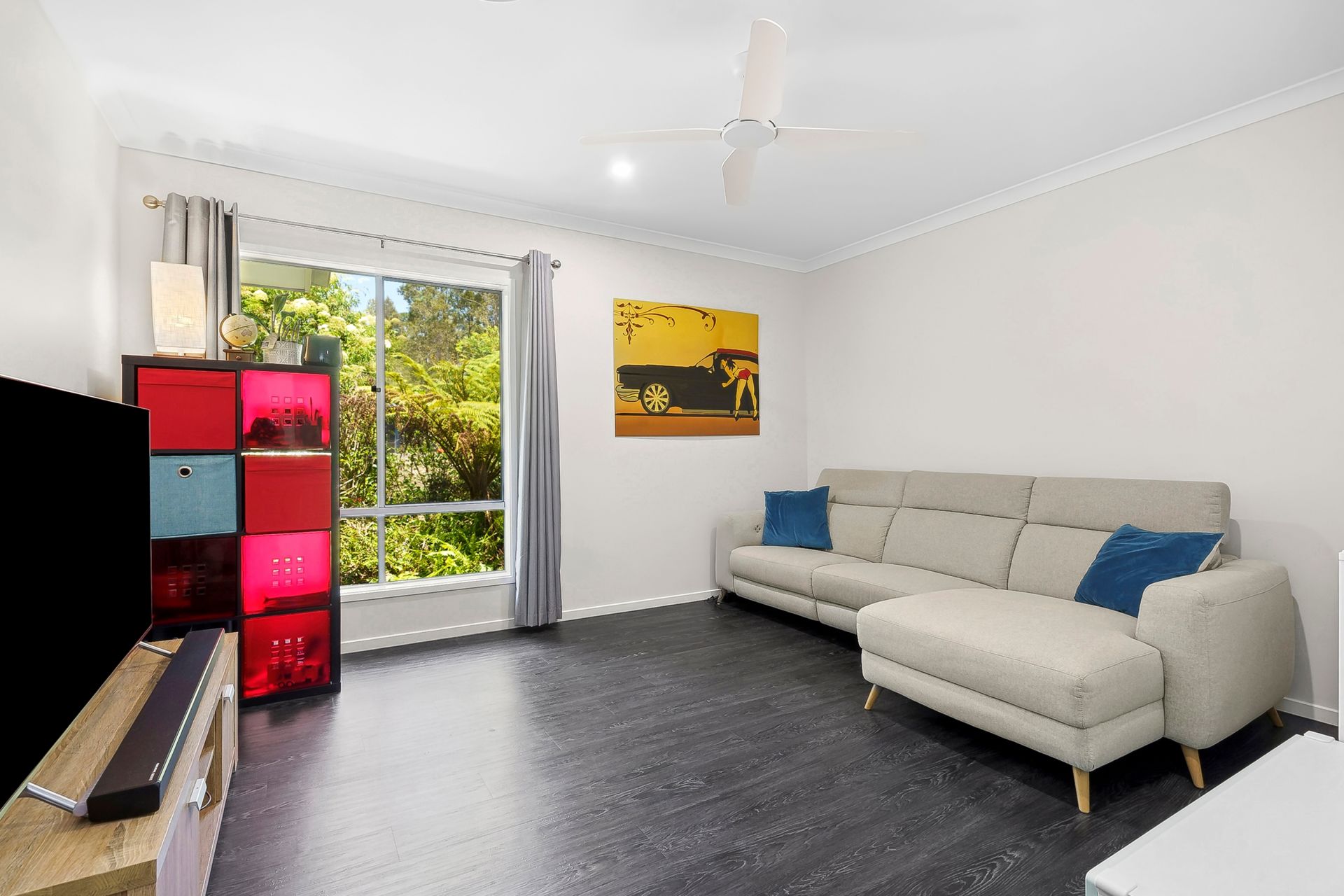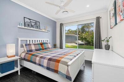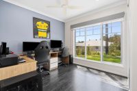 Thoughtfully designed for family living, the home features a spacious lounge and a separate media room on opposite ends of the house, creating versatility for both relaxation and entertainment. Whether you use the media room as a children's retreat, office, or additional lounge, the layout adapts to your needs. The home’s vinyl plank flooring seamlessly flows from front to back, adding warmth and style, while ducted air conditioning and a 16kW solar system keep comfort high and energy costs low.