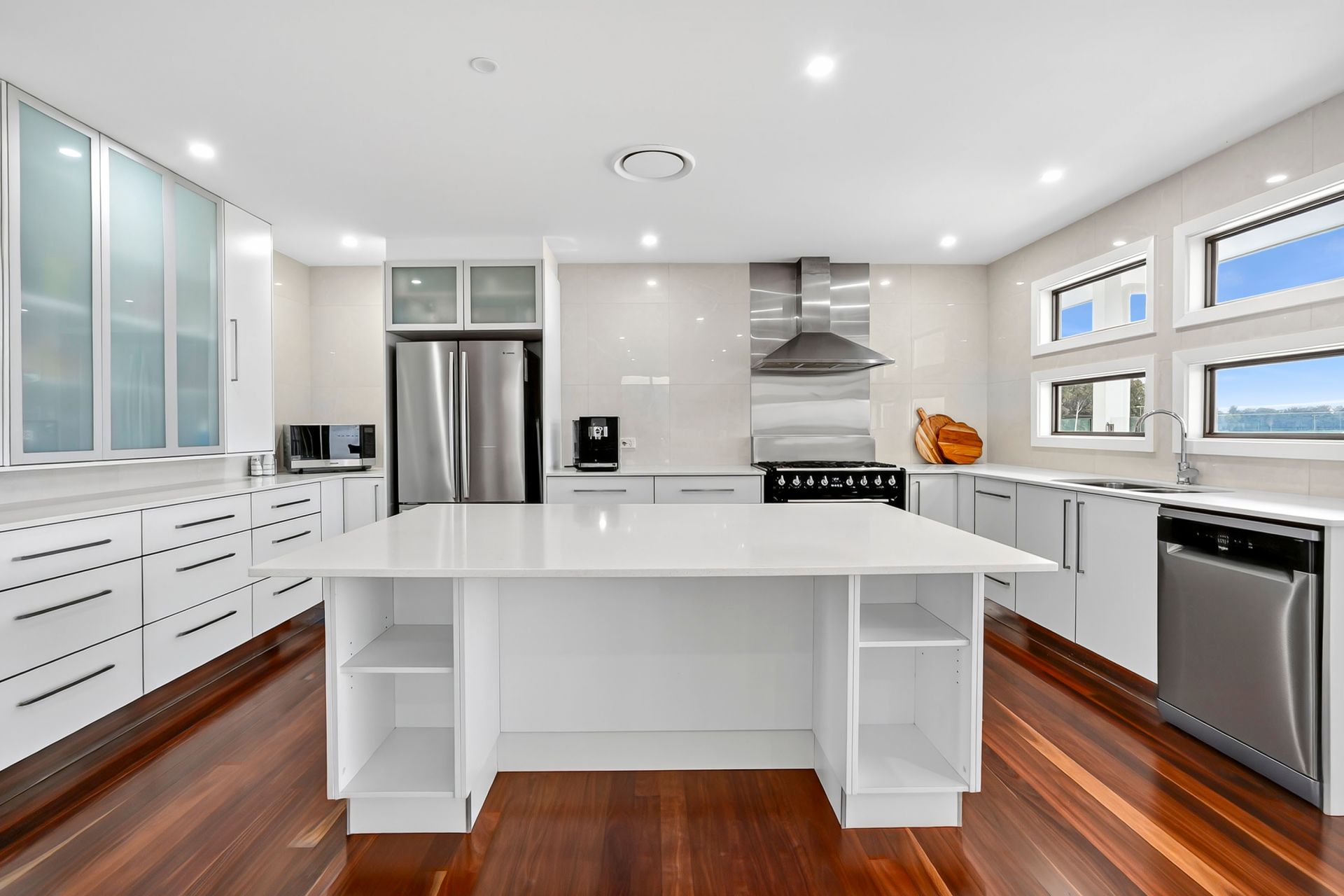 900mm oven, 5-burner gas cooktop, dishwasher, moveable island