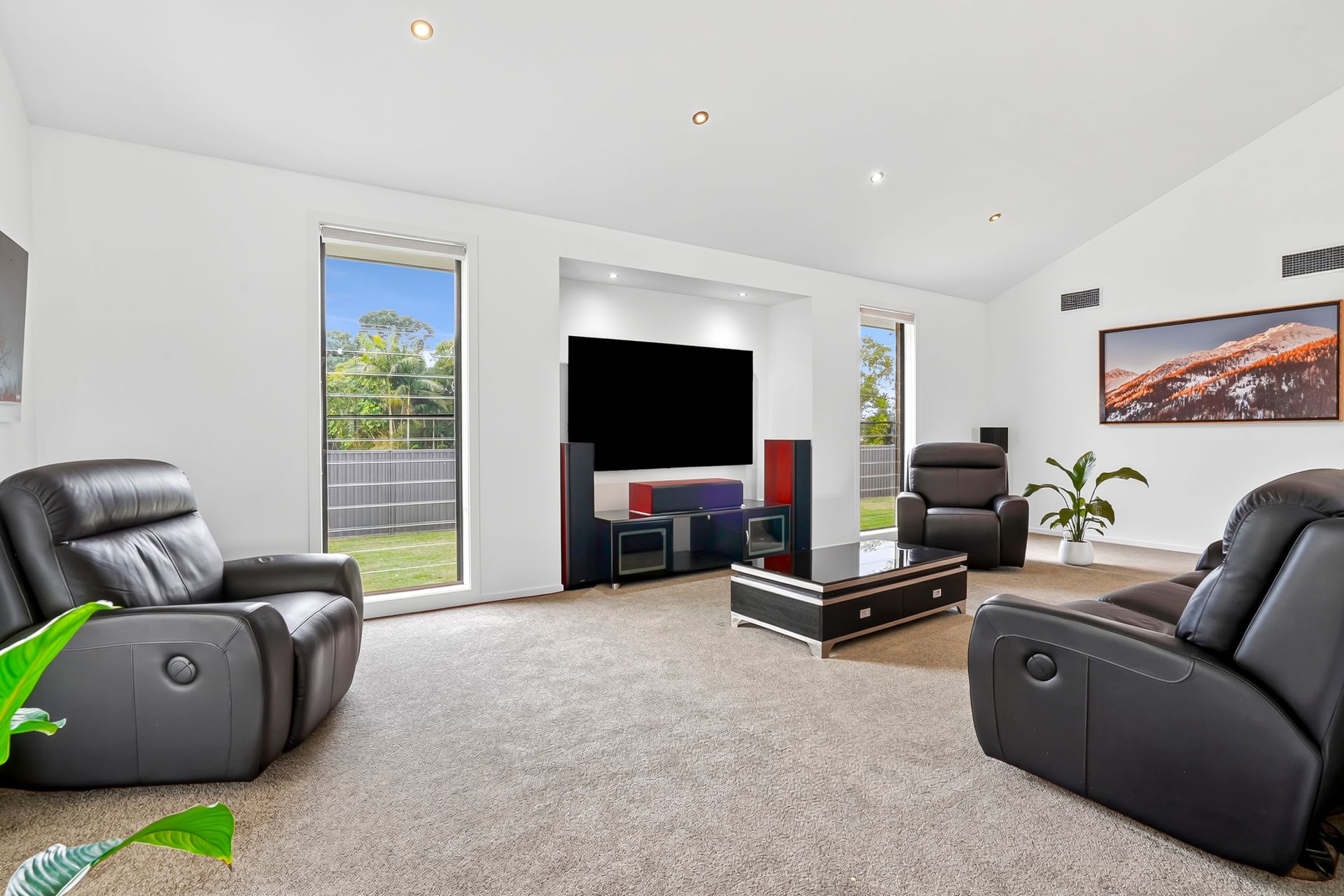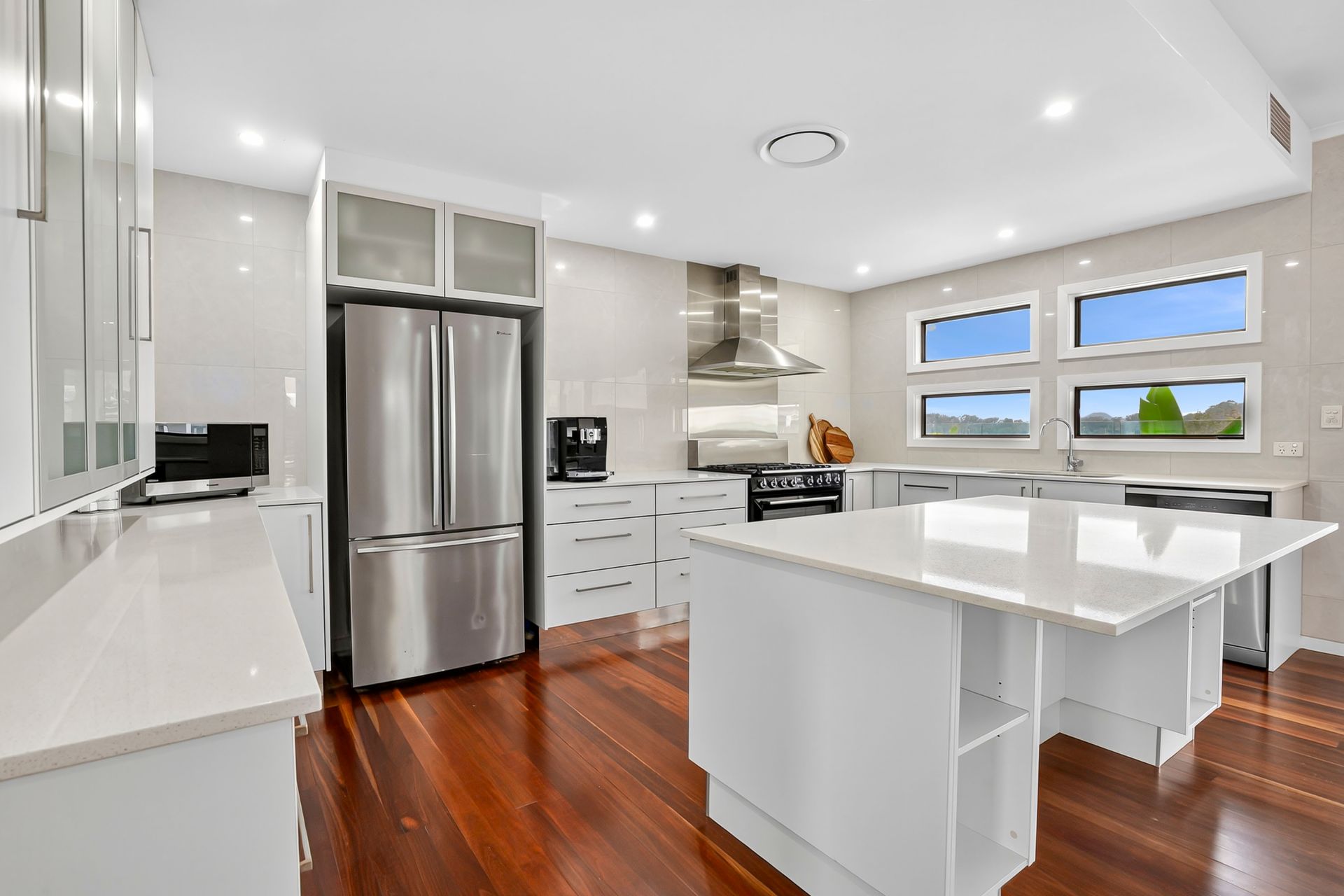 The gourmet kitchen includes 20mm stone benchtops, a 900mm oven, 5-burner gas cooktop, dishwasher, and moveable island bench. Multiple living areas include a formal lounge with soaring vaulted ceilings and an open-plan family/dining space.